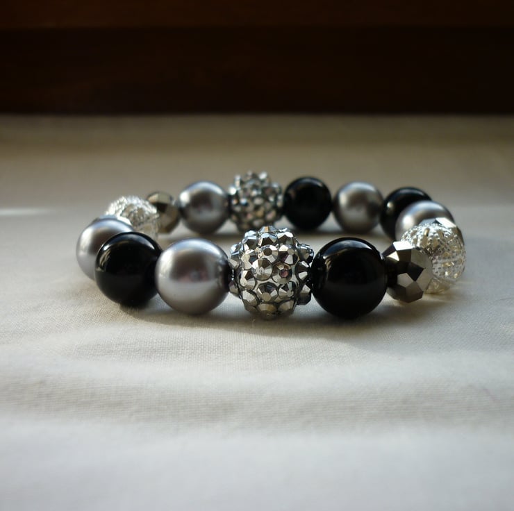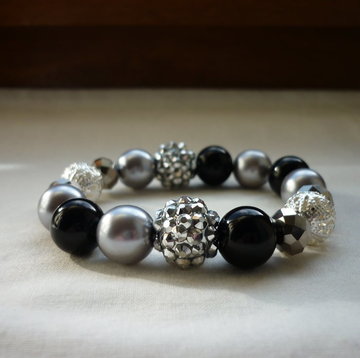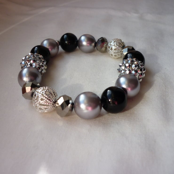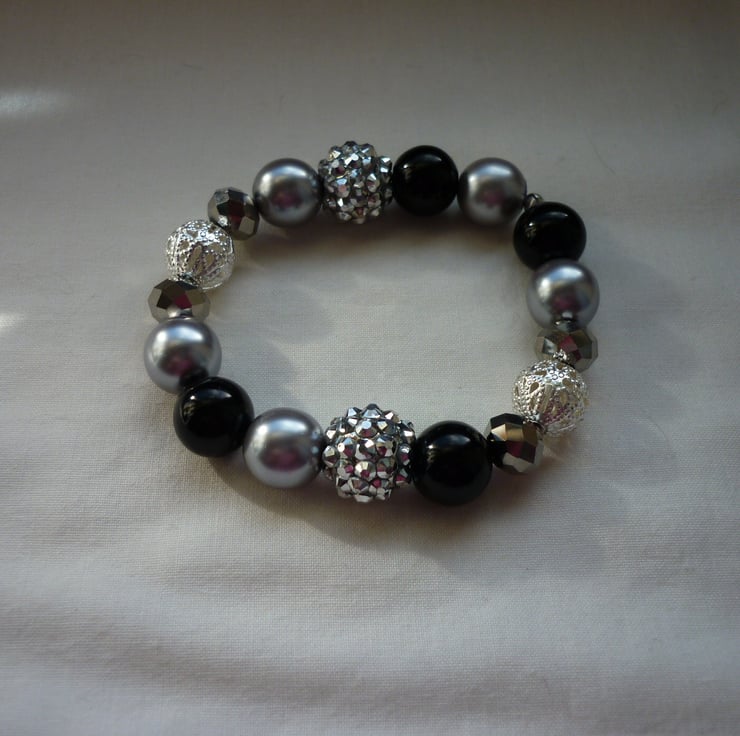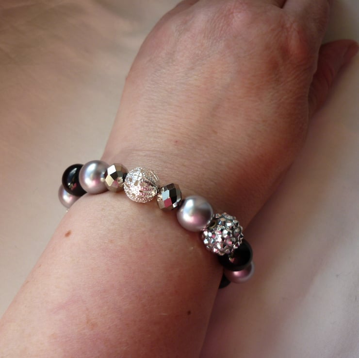 THE BRACELET HAS BEEN MADE WITH 12MM GLASS PEARLS IN BLACK AND GREY ALONG WITH SILVER PLATED 12MM FILIGREE ROUND BEADS, FACETED GLASS RONDELLE SILVER PLATED BEADS AND SILVER RHINESTONE RESIN ROUND BEADS, WHICH HAVE ALL BEEN STRUNG ONTO BEADALON ELASTIC CORD.