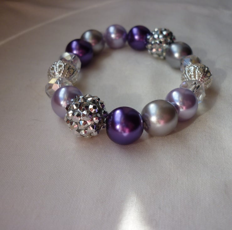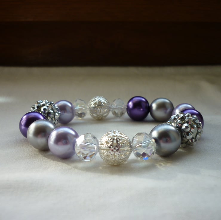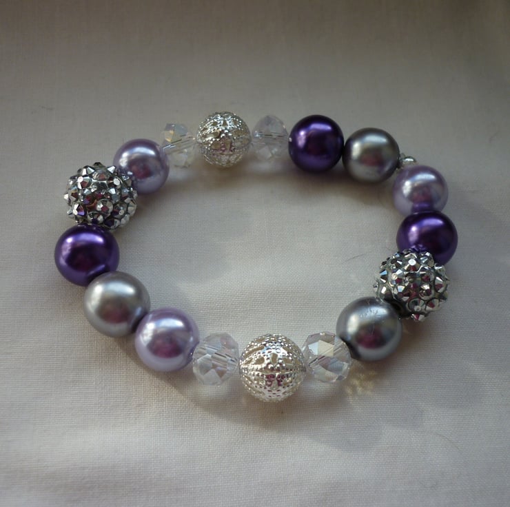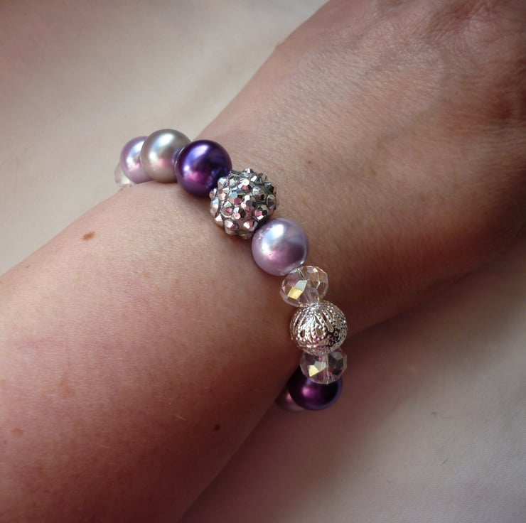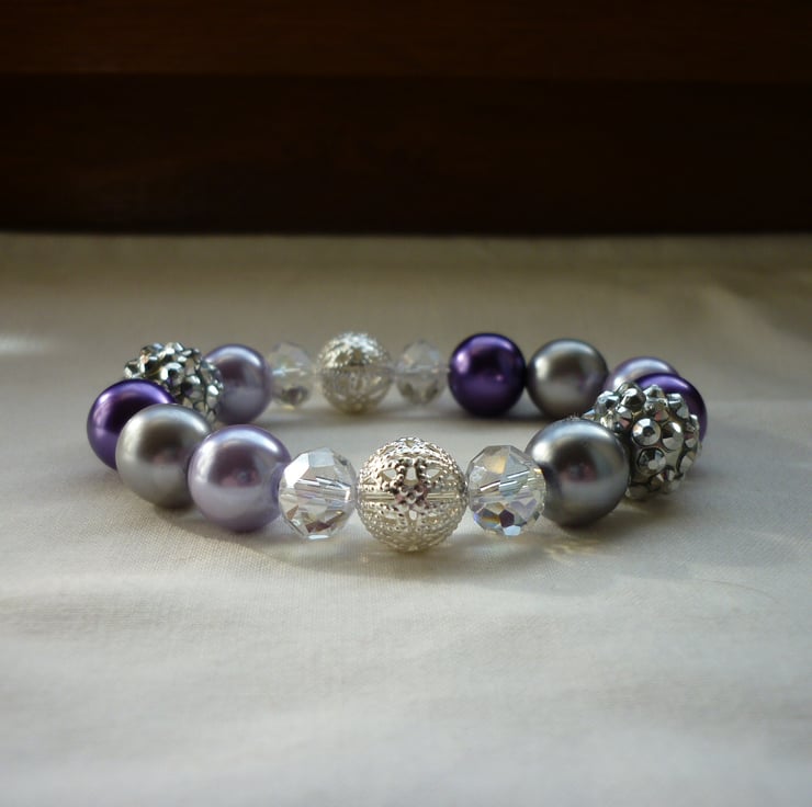 THE BRACELET HAS BEEN MADE WITH 12MM GLASS PEARLS IN SHADES OF PURPLE, GREY AND LILAC ALONG WITH SILVER PLATED 12MM FILIGREE ROUND BEADS, AB CRYSTAL FACETED RONDELLE GLASS BEADS AND SILVER RHINESTONE RESIN BEADS WHICH HAVE ALL BEEN STRUNG ON BEADALON ELASTIC CORD.