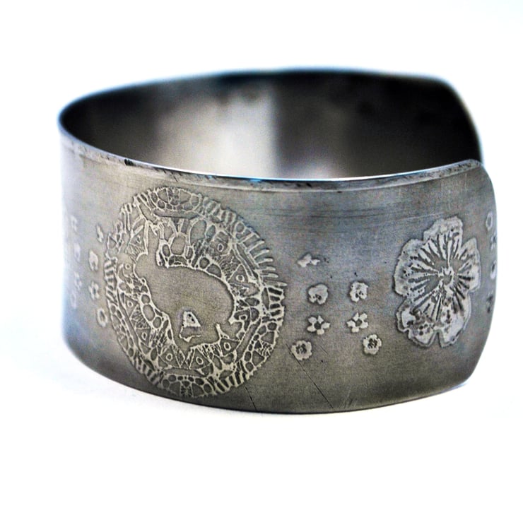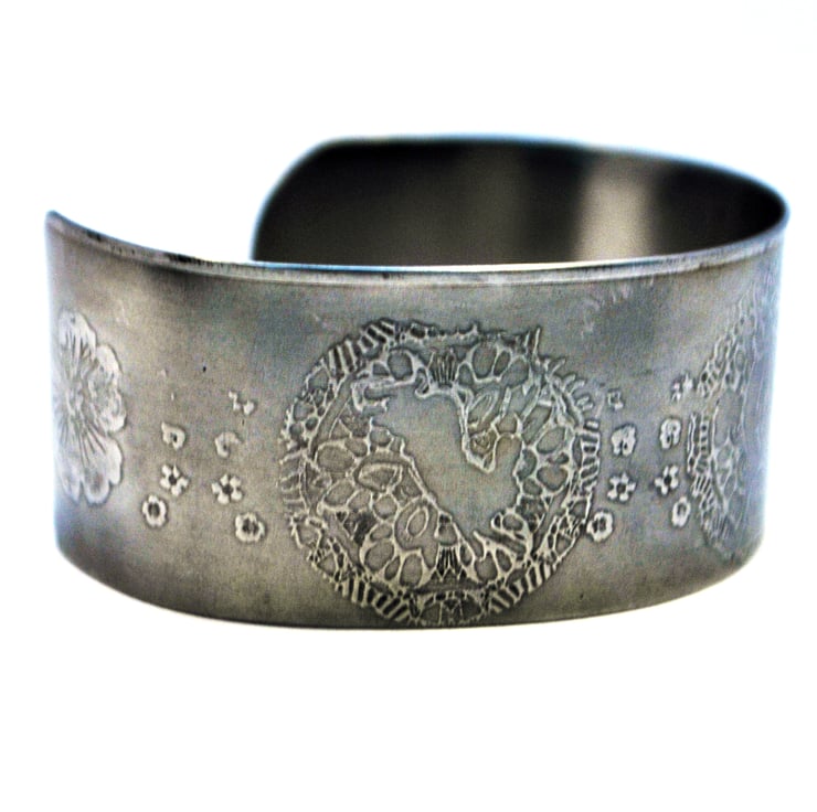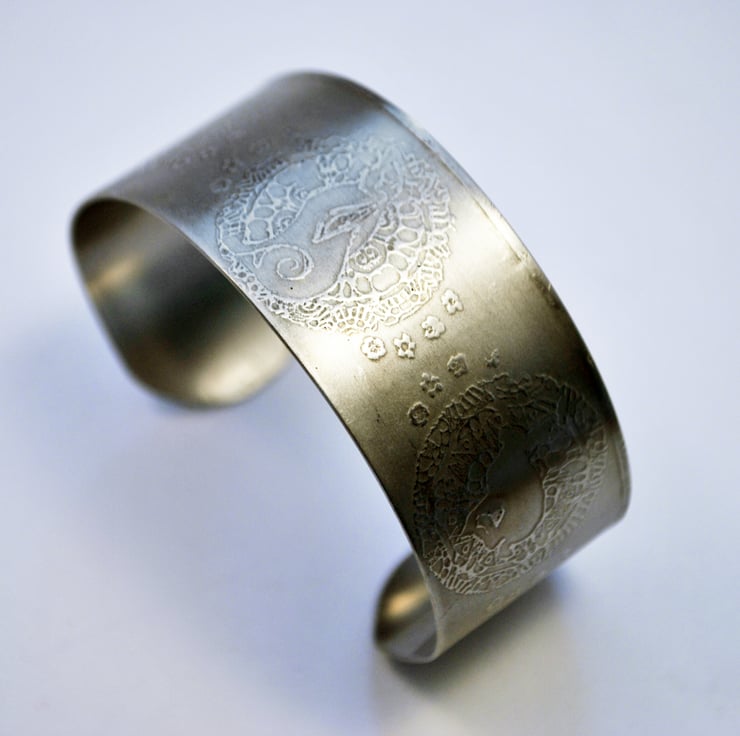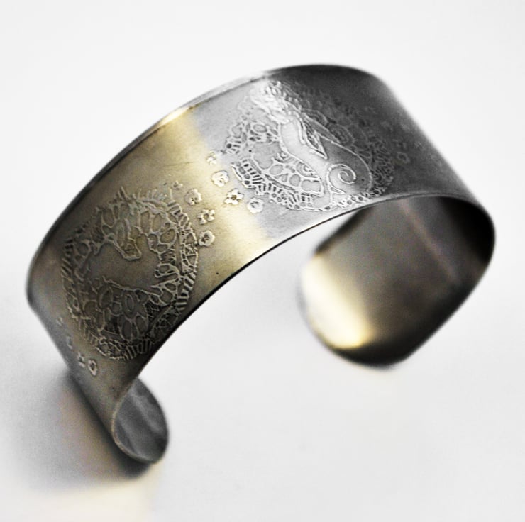 This steel silver cuff has the image of running, jumping and moongaziing hares etched onto the surgical steel surface, polished to create definition and contrast. I use environmentally friendly etching processes when producing my designs, and each piece is subtly unique. This will not tarnish as it is polished stainless steel: it is often mistaken as silver, but I would say it is more the colour of raw platinum.