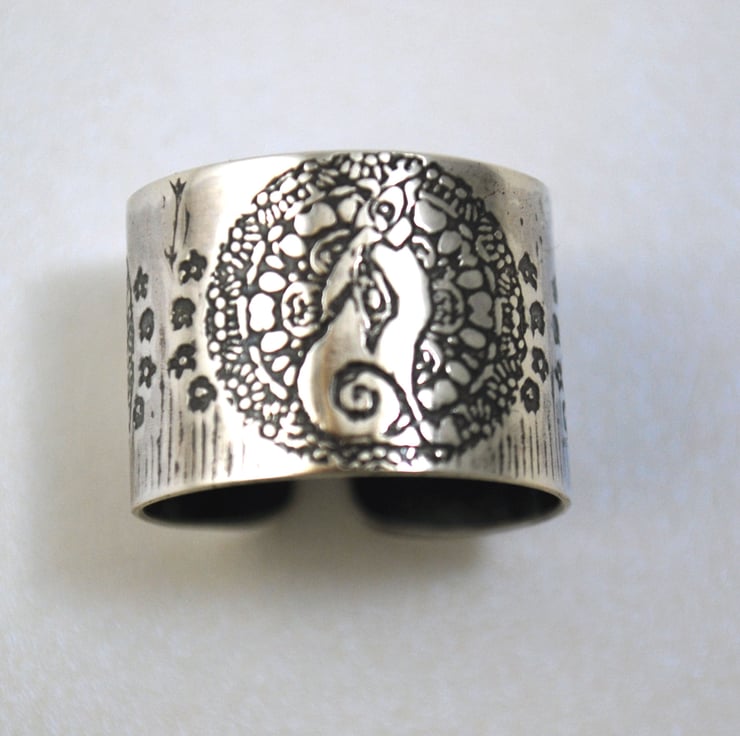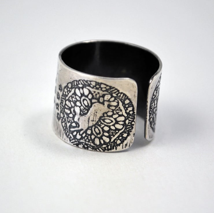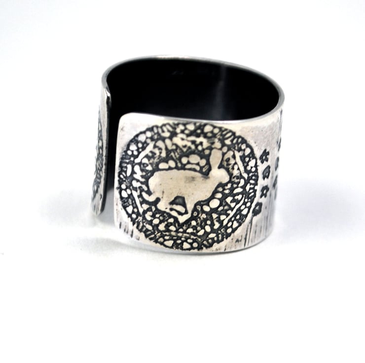 This adjustable etched silver hare ring is approximately 1.5cm deep and bears the image of running, jumping and moongazing hares on a patterned disks accompanied by flowers. The silver is recycled and can be oxidised the enhance the pattern work, or left with a mirror polished finish (please specify upon purchase which you prefer) hand cut and formed using traditional jewellery tools.
