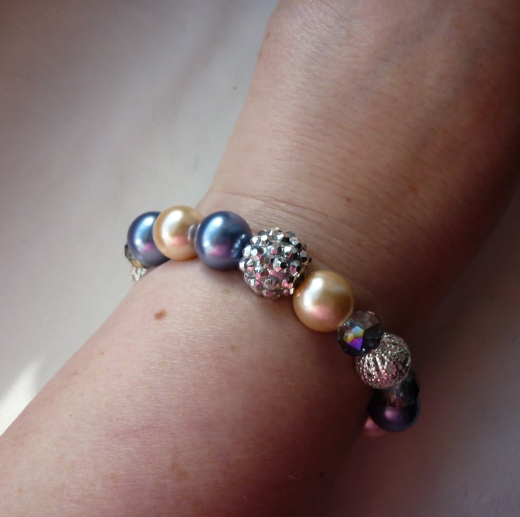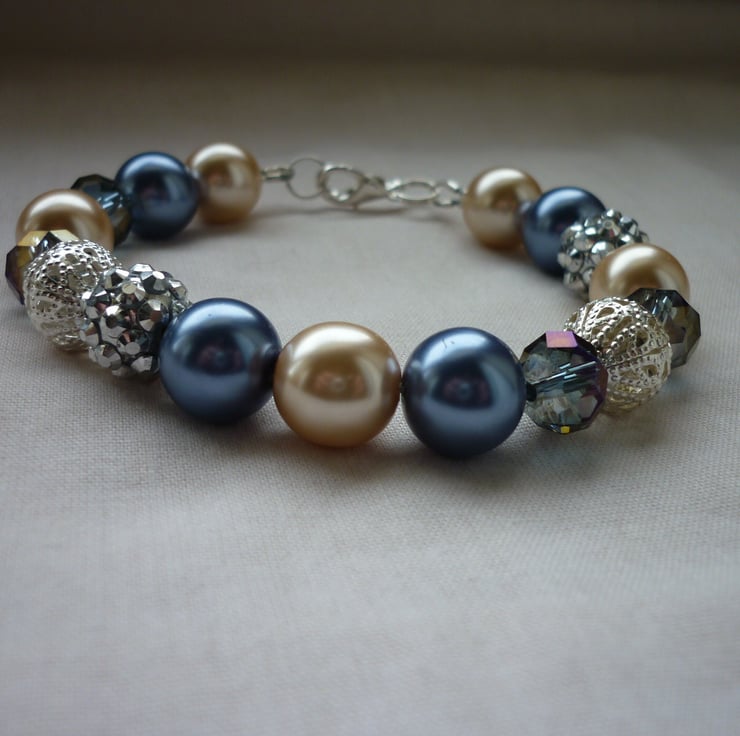 THE BRACELET HAS BEEN MADE WITH 12MM GLASS PEARSL IN SHADES OF SLATE BLUE AND CREAM ALONG WITH SILVER PLATED FILIGREE ROUND BEADS, FACETED GLASS RONDELLE BEADS IN CRYSTAL WITH MULTI COLOURED PLATE TO THEM AND SILVER RESIN RHINESTONE BEADS. THE BRACELET HAS BEEN FINISHED WITH SILVER PLATED LOBSTER CLASP AND FINDINGS.