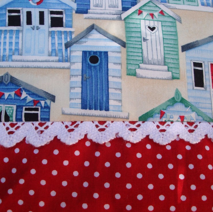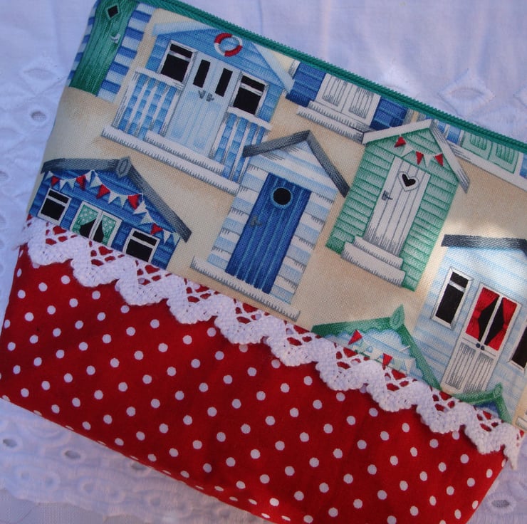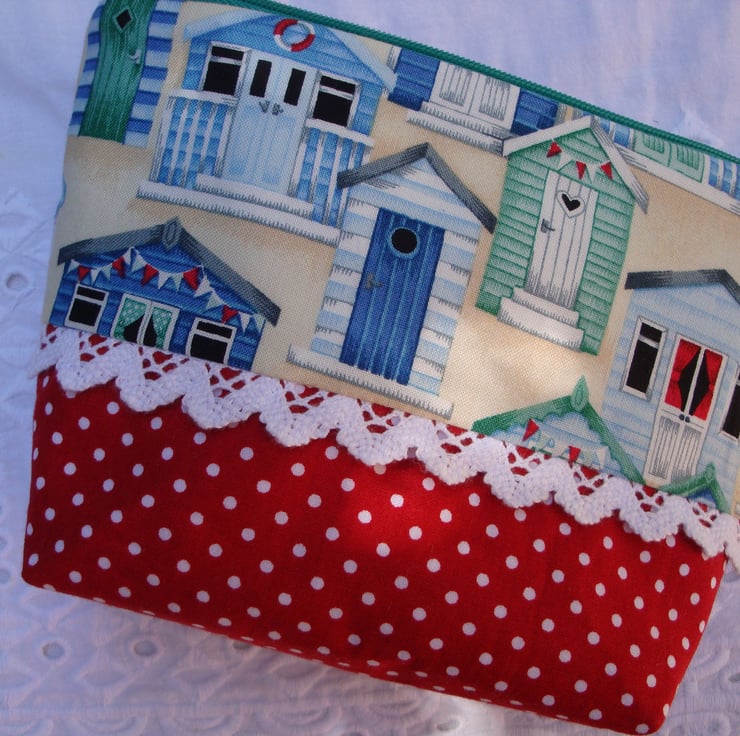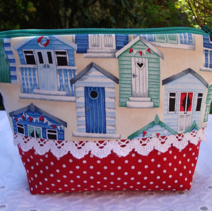Cotton Make Up Bag - Beach Huts - Red Polkadots - Lace .