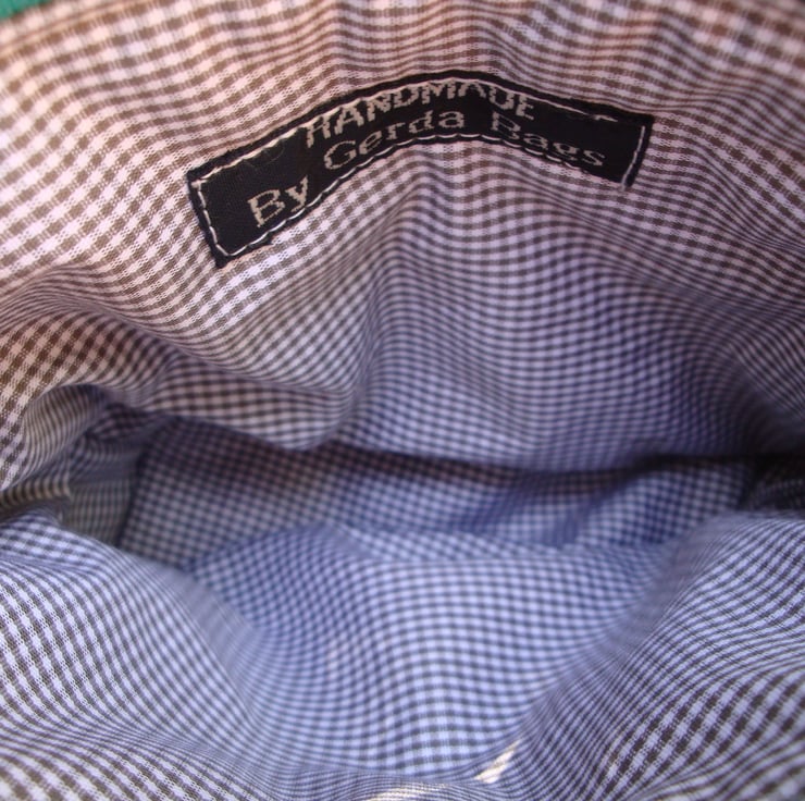 External is made in a printed cotton fabric , featuring funky Beach Huts . Lower half is made in a red polkadot cotton fabric.