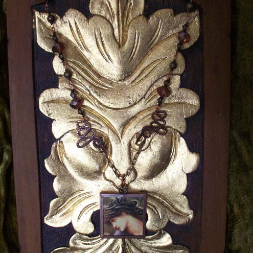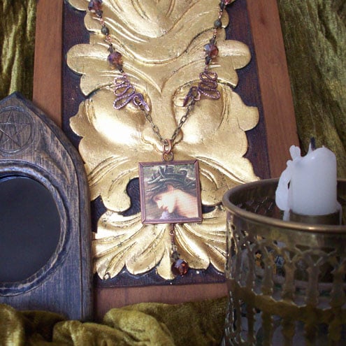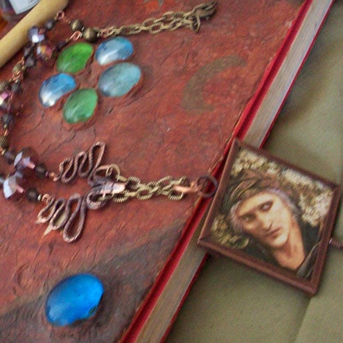 Edward Burne Jones "The Beguiling Of Merlin" . One of a kind Art Necklace. Found image mounted under glass in an antique copper frame. A powerful image, from a Pre-Raphaelite masterpiece, the head of the enchantress Nimue was taken from Burne-Jones' muse, Maria Zambaco. I have taken the theme of Nimue's Medusa-like headress and forged handmade copper snakes to frame the image. The purplish tones of her dress are echoed in the dusty pink faceted lustre glass beads, with smoky quartz bicornes and antique brass beads. There is a drop from the image too. The image of Merlin is on the reverse. Comes to you in a gift box. Multiple and overseas postage prices on application as costs vary.