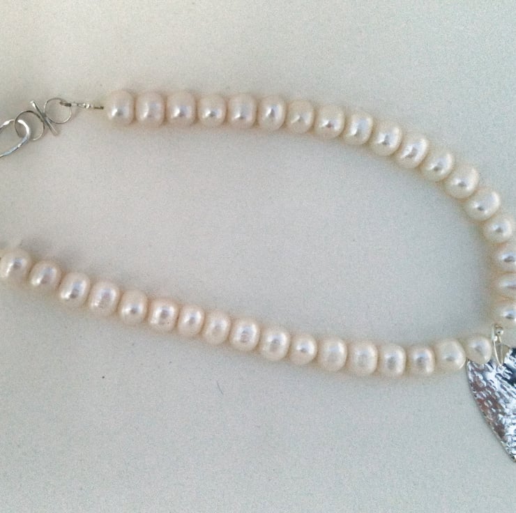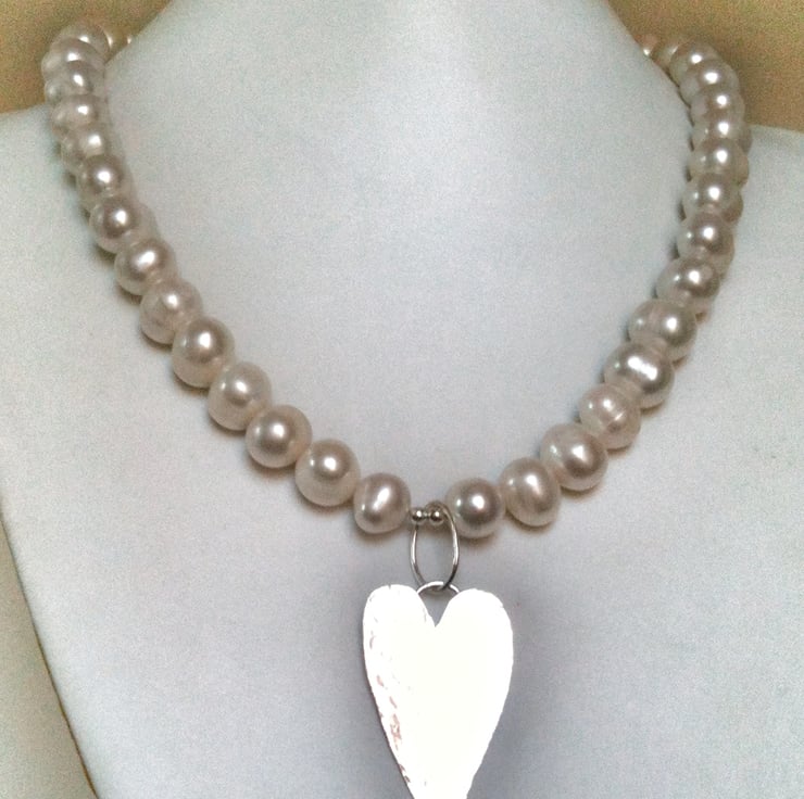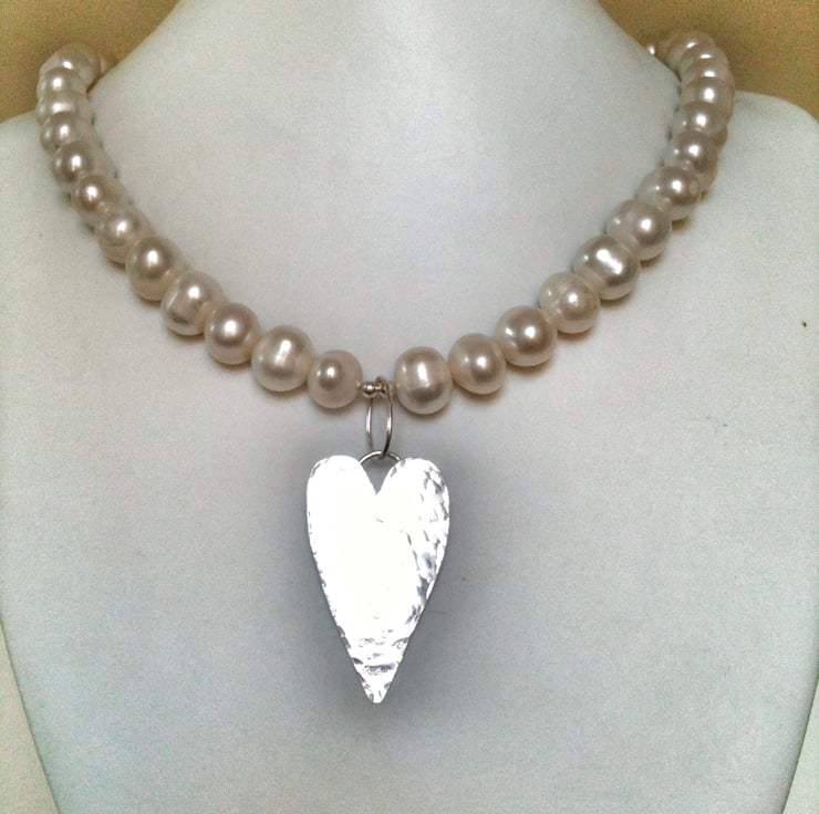 These gorgeous white 8mm pearls have been made into a simple heart necklace. The findings and heart are sterling silver and are all hand cut, filed and soldered. The necklace measure 16.5 inches and the heart is texturized by hammering and measures about 1.5 inches long and roughly 1 inch wide.