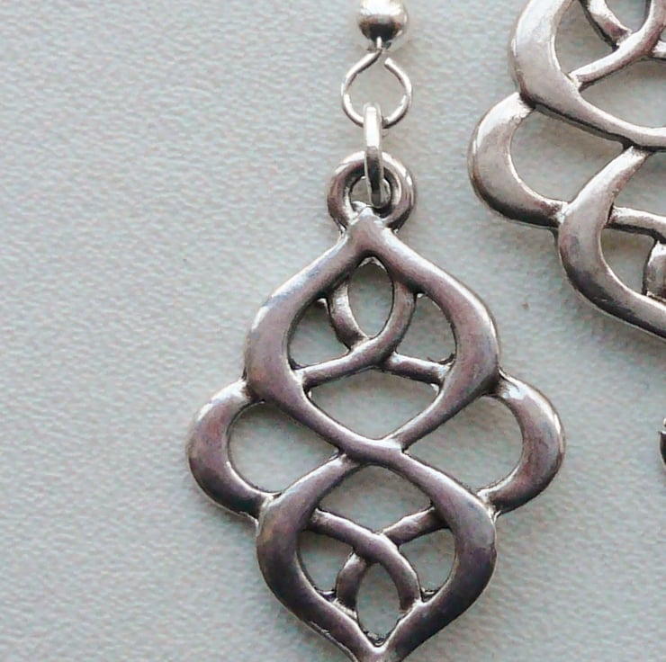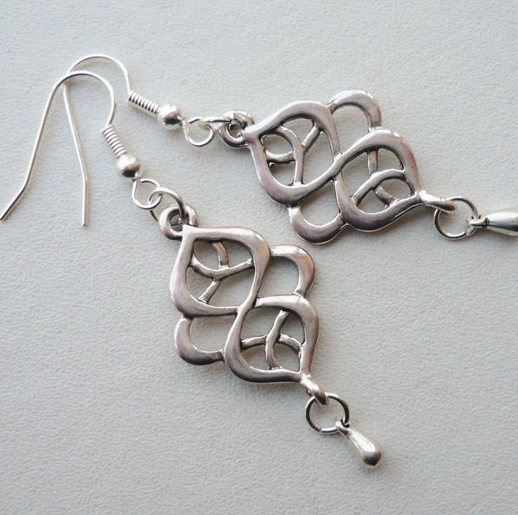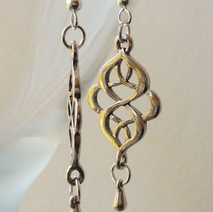 This pair of earrings is made up of 25mm long Tibetan silver celtic style connectors with 5mm silver plated drop bead below. Attached to silver plated ear hooks, they measure approx 5.5cm incl hook.