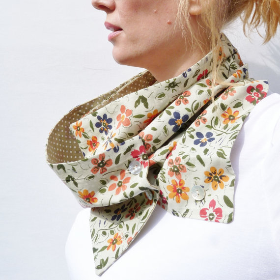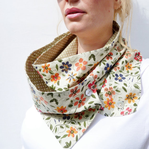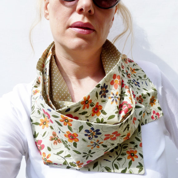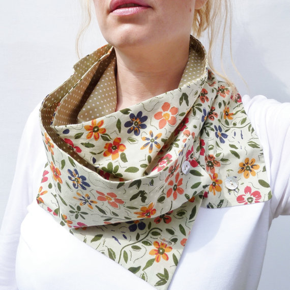 Fabulous womens infinity scarf handmade from this top quality Irish cotton pale green floral fabric. The scarf fastens with 3 shell buttons which makes the scarf versatile and is fully lined with a coordinating cotton polka dot fabric. The scarf is designed to twist and wrap around the neck twice. Leave it unbuttoned and it works as a regular scarf too!