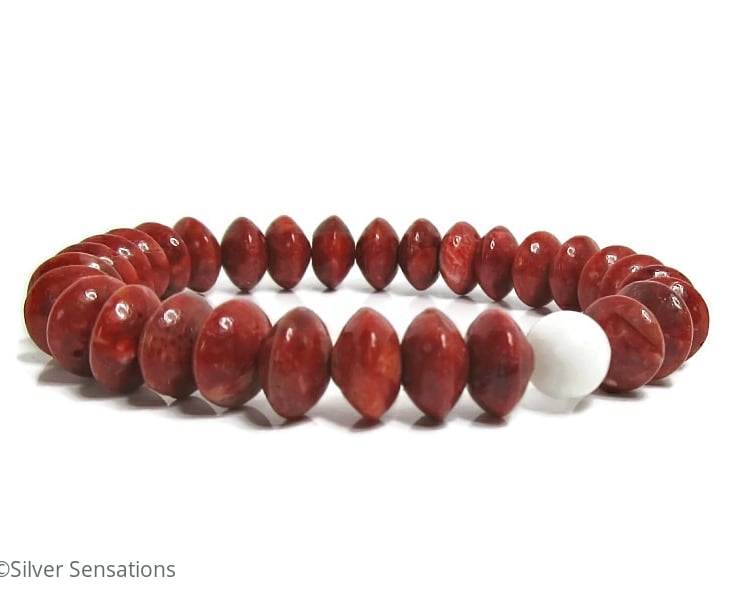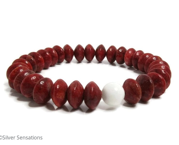 This hand made medium chunky stretch bracelet is 7" in length and is made with Red Sponge Coral rondelle beads with an 8mm Snow White Agate round bead in the middle.
