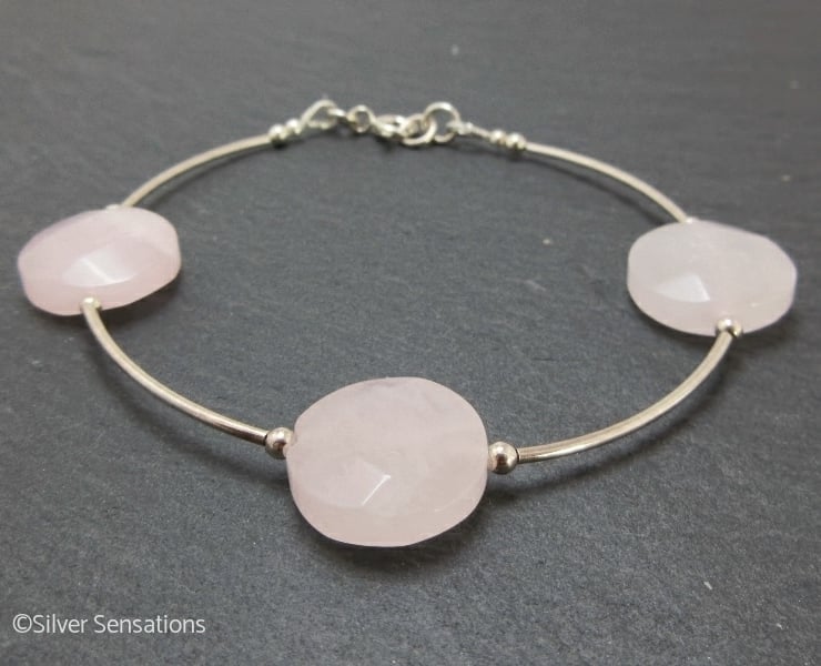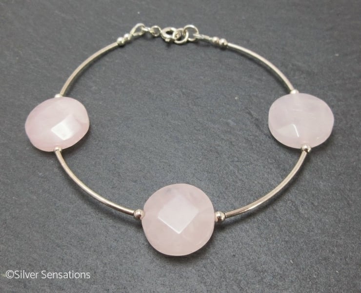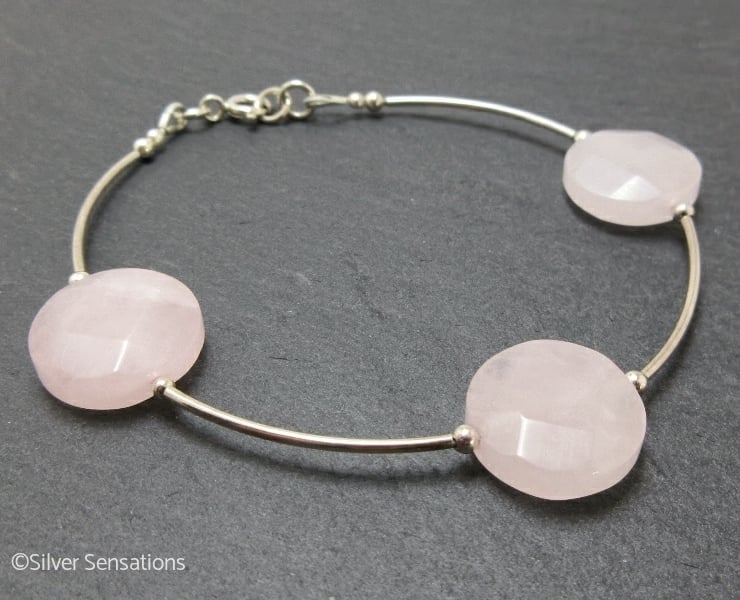 This feminine designer bracelet has been hand crafted using deeper pink Rose Quartz faceted coin beads which are 15mm in size. In between each bead are Sterling Silver beads and curved tubes.