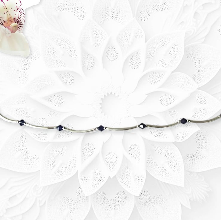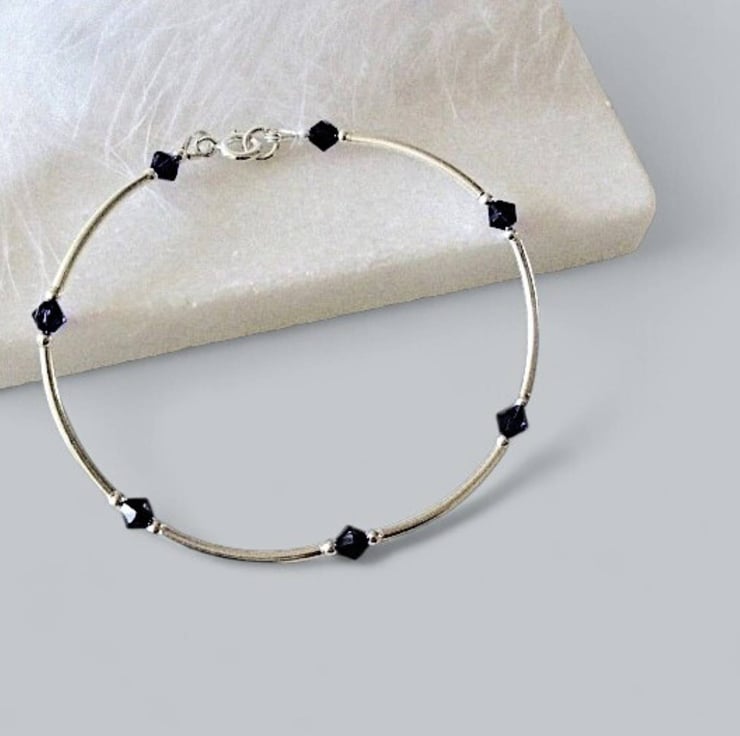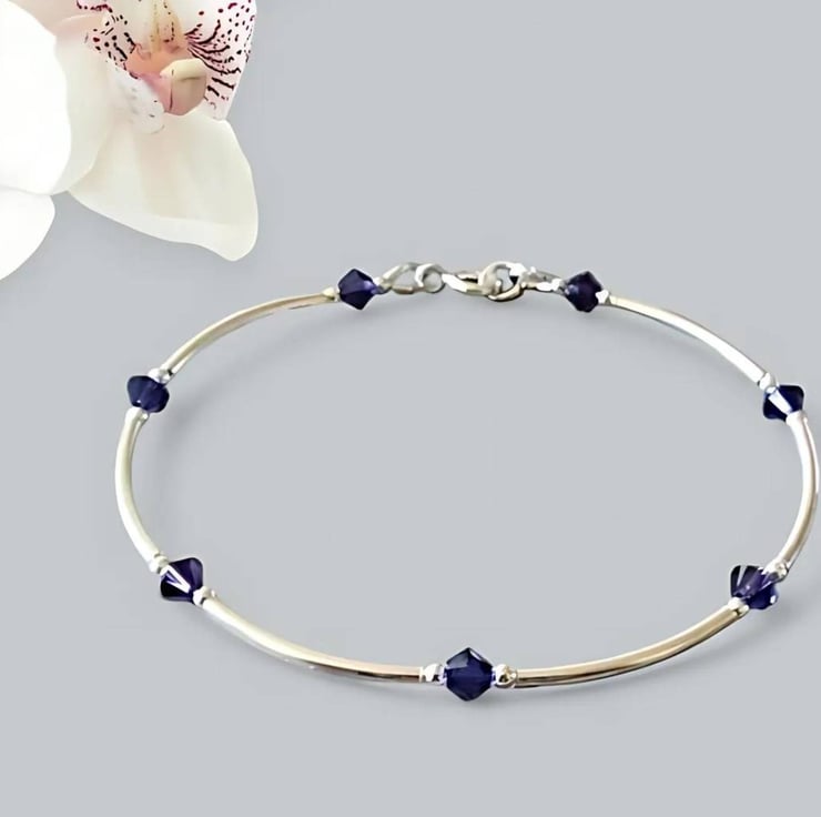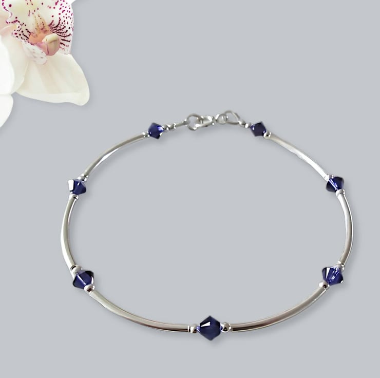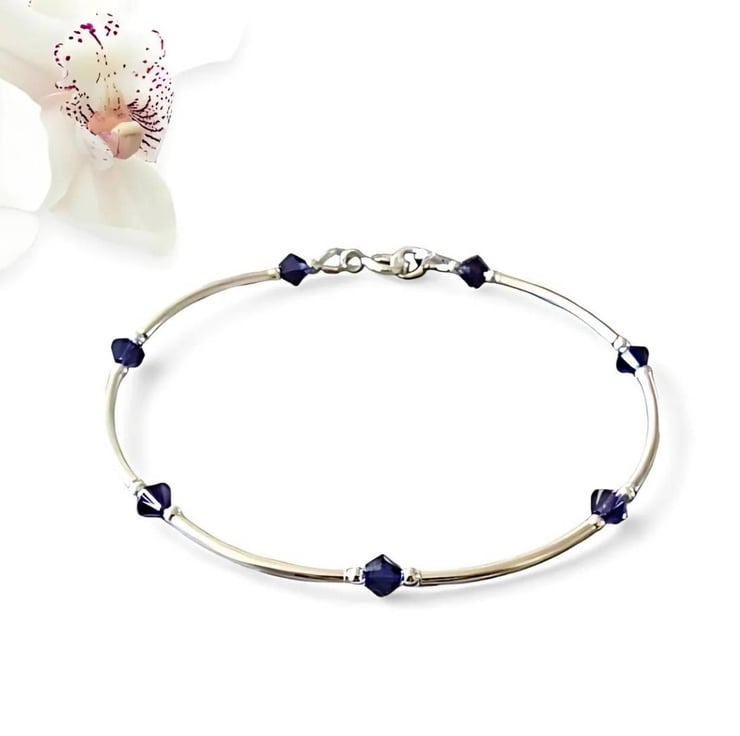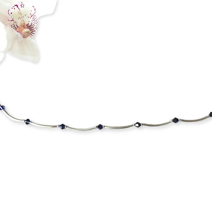 A beautiful, designer bracelet which I hand crafted using Sterling Silver curved tubes & round beads with stations of highest quality dark purple crystals from Austria.