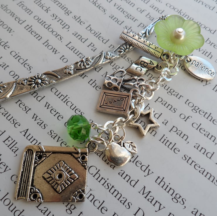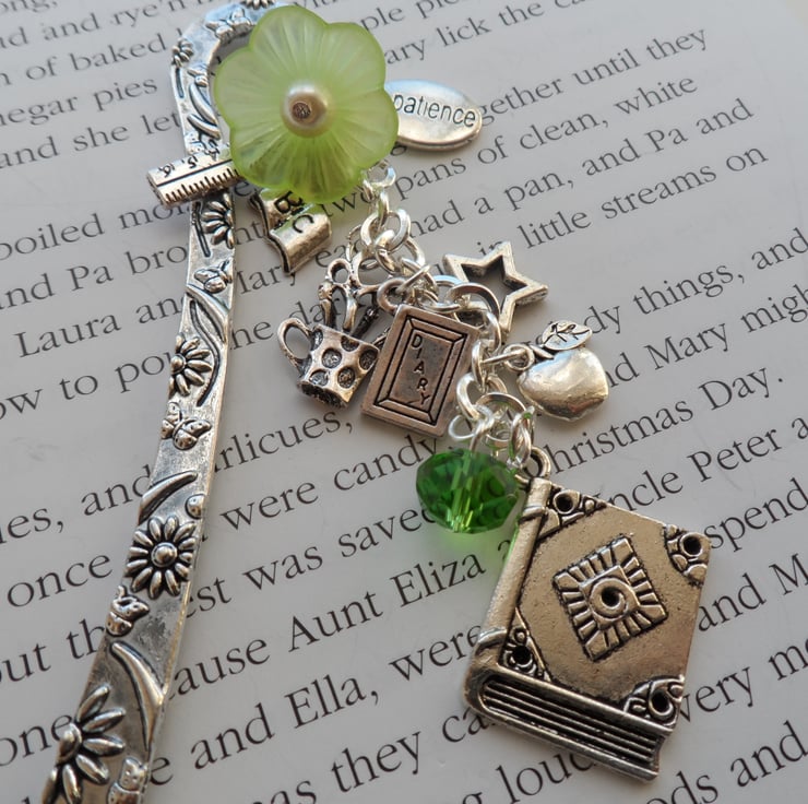 Keep your page in style with this lovely bookmark, it has a book charm, a Green flower bead a little apple,ruler,diary,patience charm all hanging from an antique silver plated curved bookmark measuring 12cm