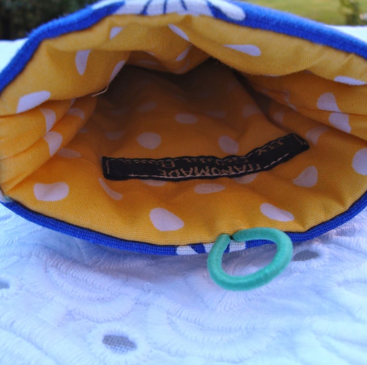 External has been made in a pretty Daisy cotton print , and I added a green piping round the edge ( see photo ) .