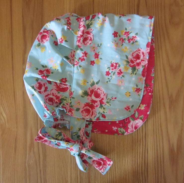 This listing is for a bonnet, made to order, any age from newborn to 6 years. It can be ordered in one of the rosebud designs in cream, baby pink or baby blue or a combination (colours deeper than in pic, apologies for my camera). See other listing for bouquet fabric in photograph.