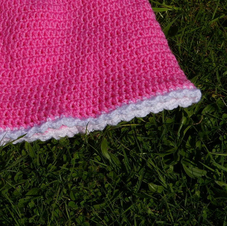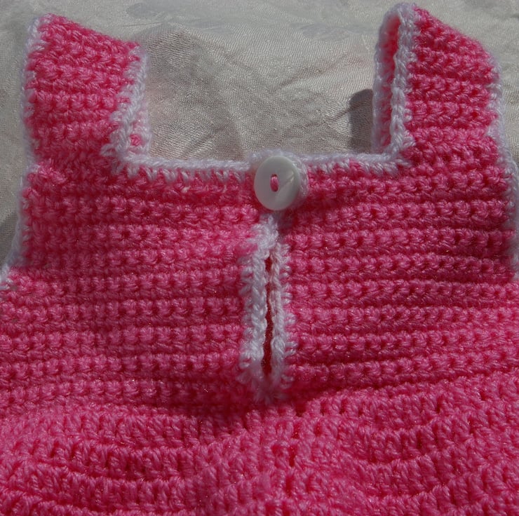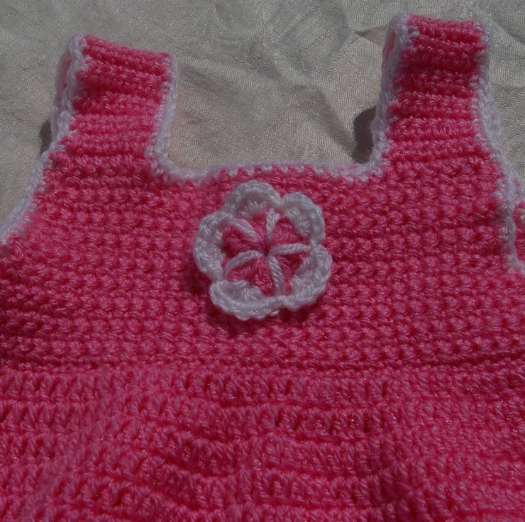 A pretty baby sundress crocheted in pink and white. I have used 100% acrylic yarn so it can be machine washed at 40%. It would be best to lay it flat to dry so the dress keeps its shape. The dress is finished in white with an attractive shell edge pattern along the hem of the dress and has a pink and white flower decoration on the bib. The dress does up at the back with a white button.