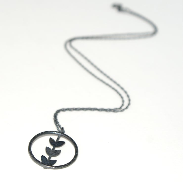 Was £26.95 A striking pendant featuring 3 hand cut leaves on a single stem set in a textured circle. Made from sterling silver and oxidised this pendant is hung from an 18 inch sterling silver chain. Please note your necklace may vary slightly from the image.