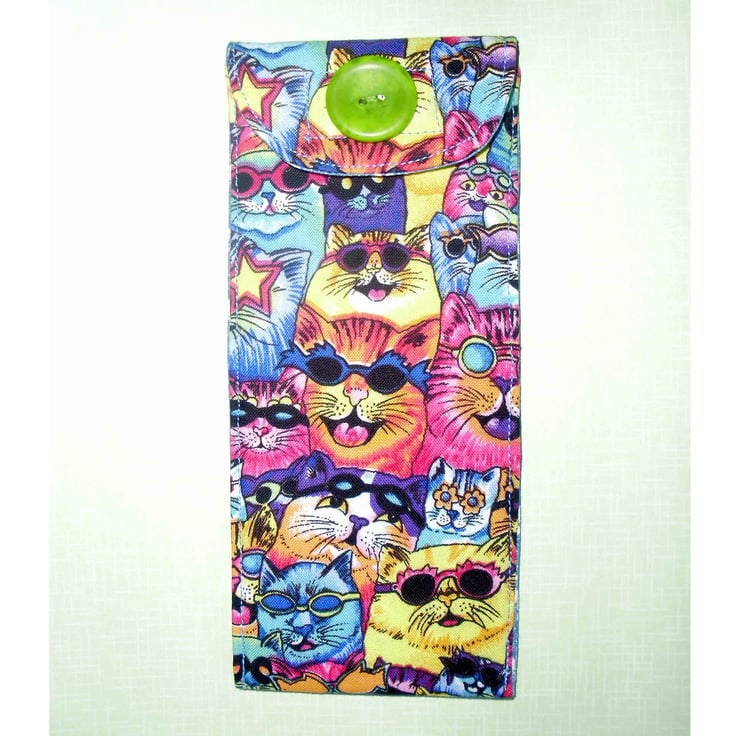 A handy case for your glasses or sunglasses.This is made from a fun Crazy cat fabric, the cats are wearing sunglasses, with a paw print lining. It also has a layer of wadding for protection. The case fastens with velcro, and has a bright decorative button.