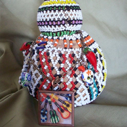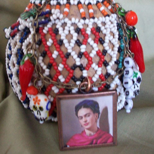 One of a kind Art Necklace. Found image of artwork mounted under glass and framed in an antique copper frame. A lovely photograph of Frida with braided hair and shawl. I was delighted to find handmade lampwork sugar skull beads, handmade glass fruit and chillis to use in this piece. These and other charms hang from a textured antique brass chain. A photo image of guitars is on the reverse. Comes to you in a gift box. Multiple and non UK postage rates on application, as prices vary.