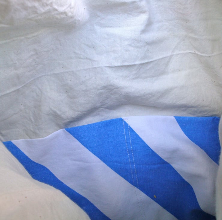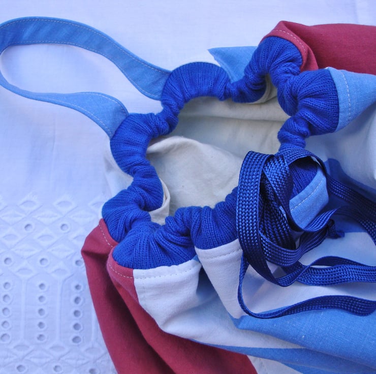 Drawstring channel at top , is made in a blue machine knitted rib ( commercial )