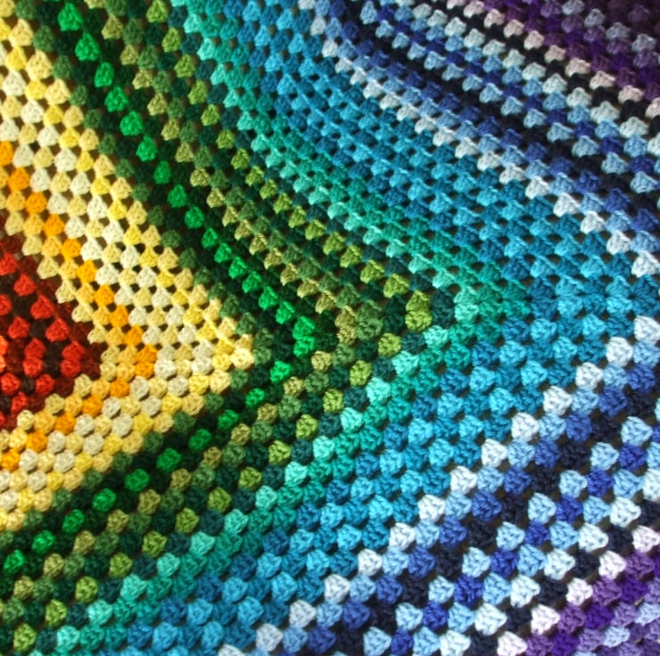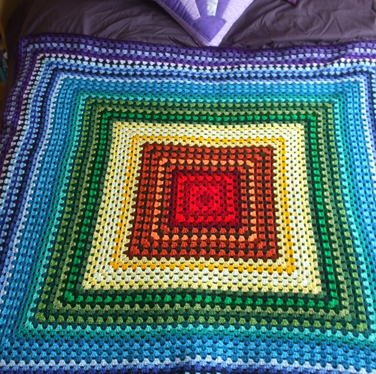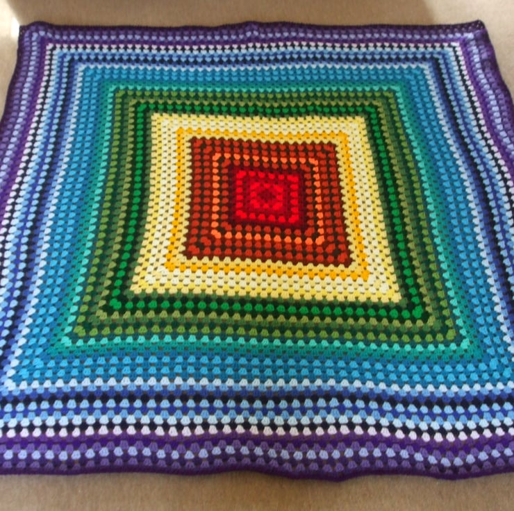 This is a traditional Granny Square blanket made using the seven colours of the rainbow red,orange,yellow,green,blue,indigo,violet.