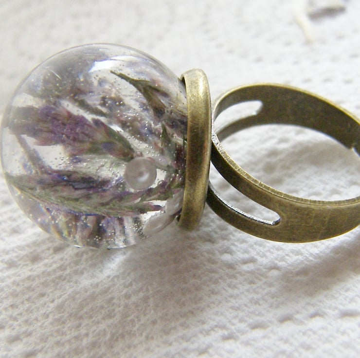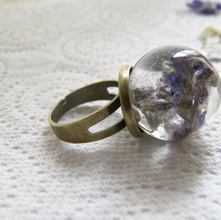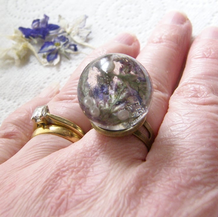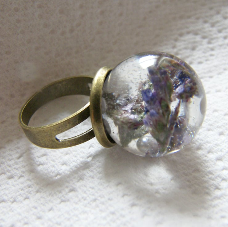 Description: I have very carefully added this lovely sea lavender to clear non - toxic uv resistant resin. Has taken me a few days of layering to achieve the result in this 20mm perfect orb. I have then mounted the orb onto a bronze plated expandable ring. Would make a lovely gift:)