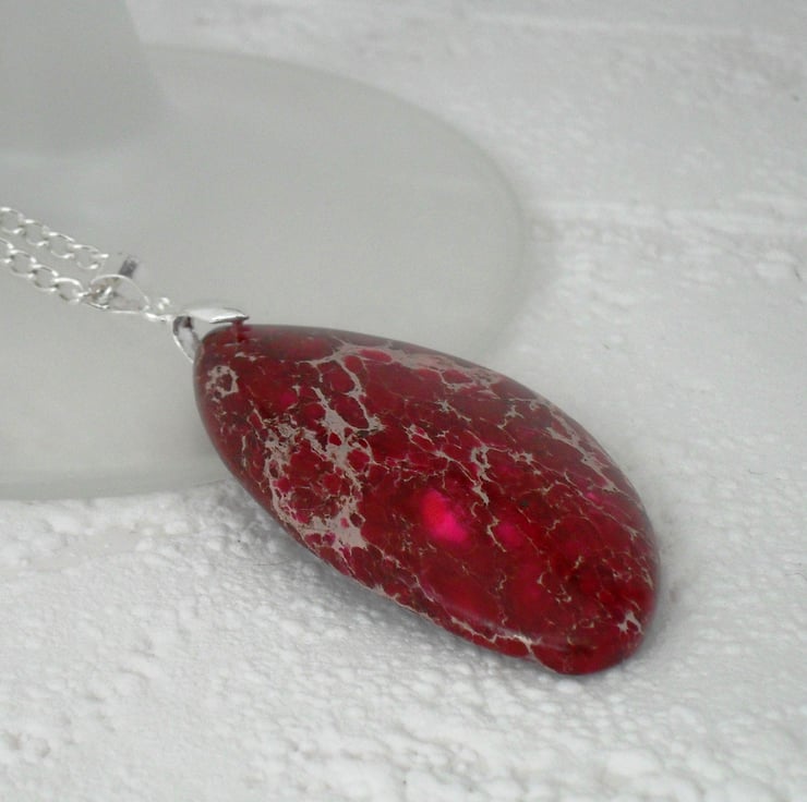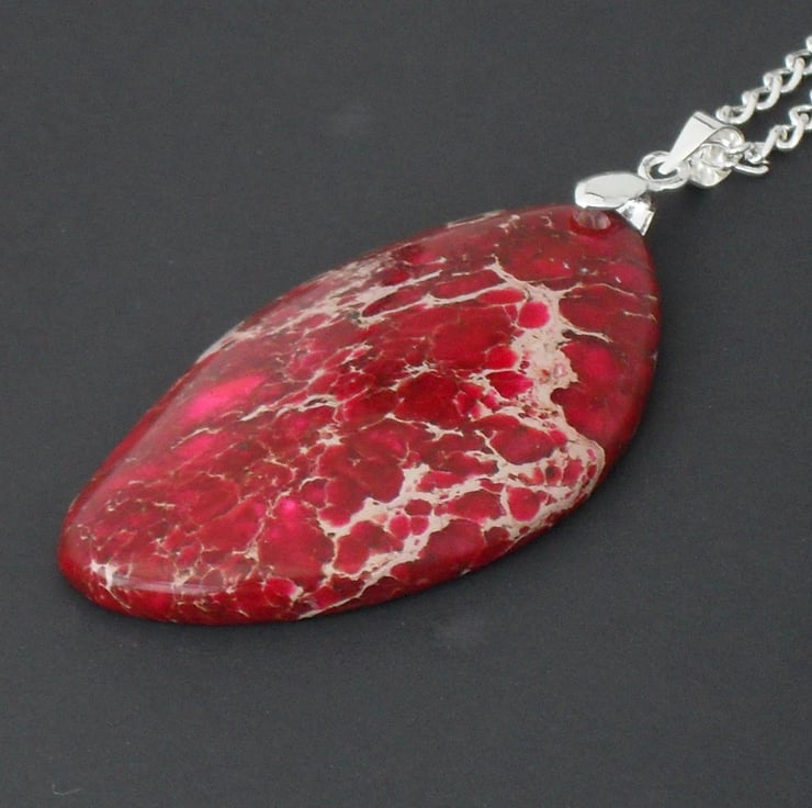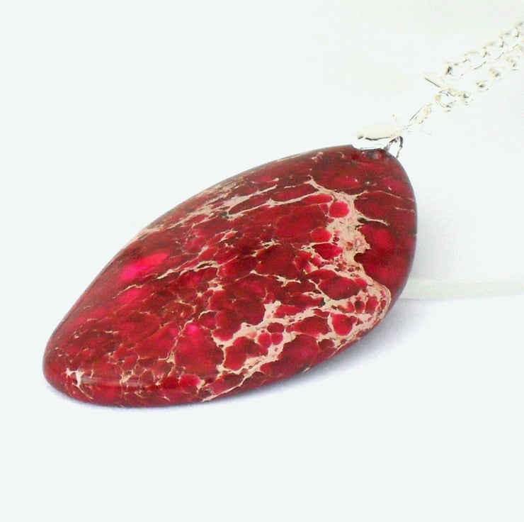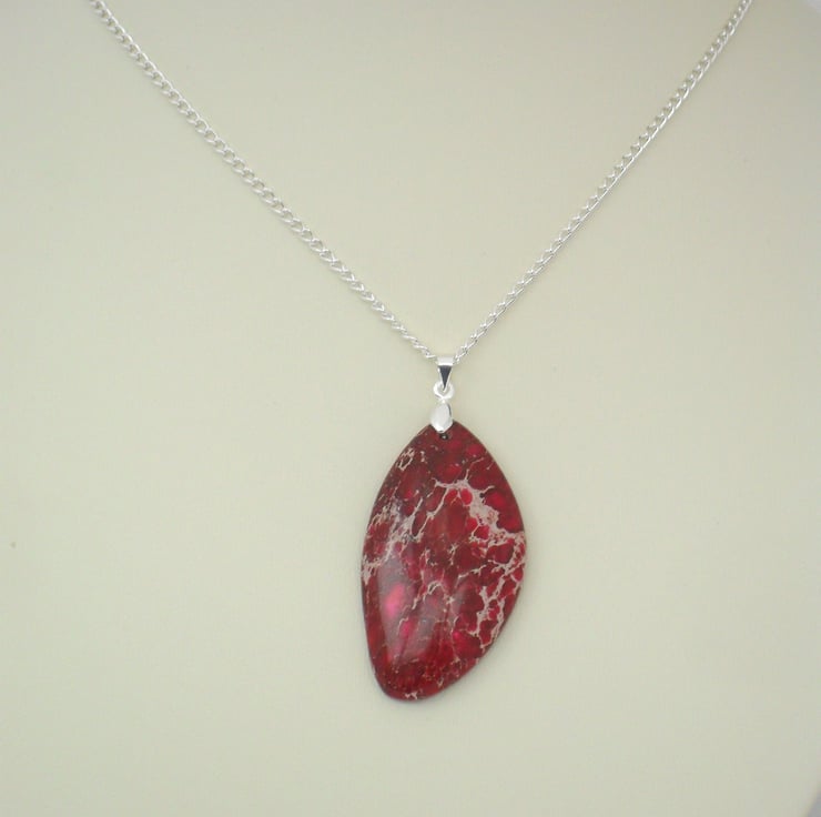 This striking red jasper semi-precious pendant hangs on a silver plated chain.