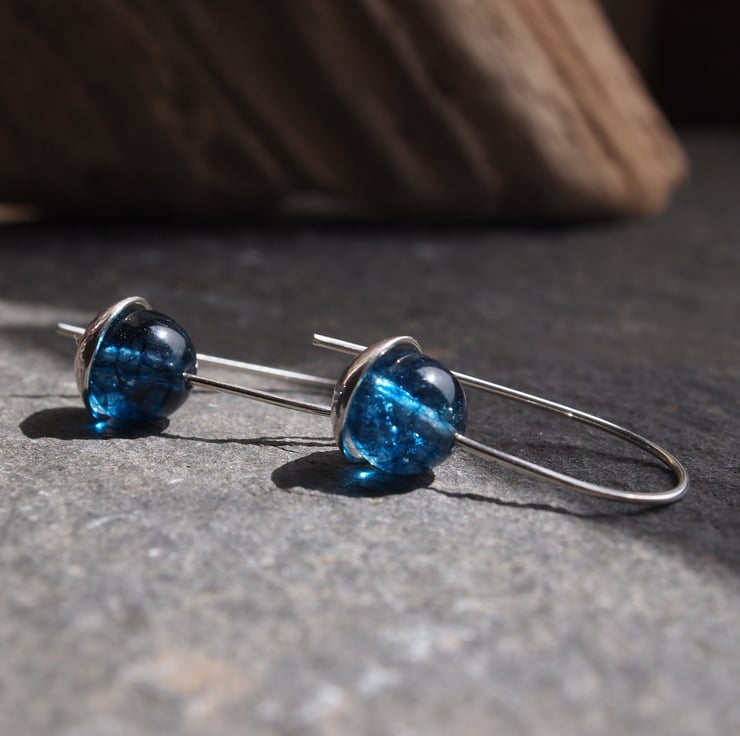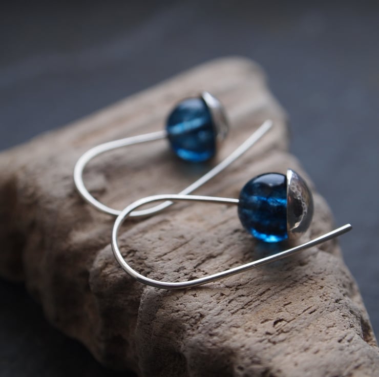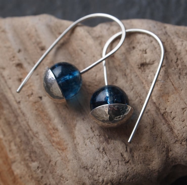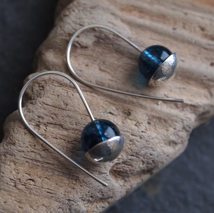 The tinted crystal beads have veins of darker blue running through them, which are highlighted as they catch the light. The blue crystal compliments the hammered silver beautifully in these understated yet stylish pair of earrings.