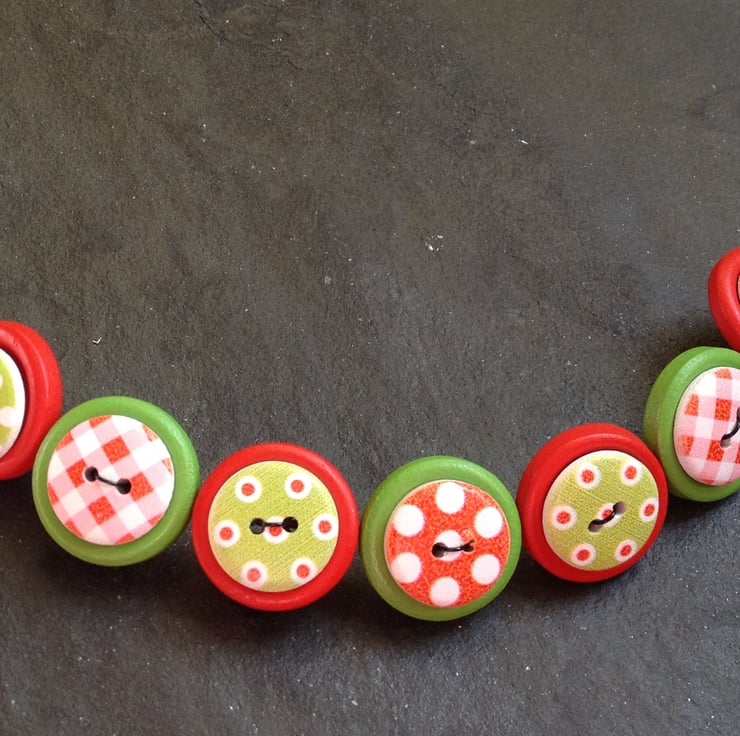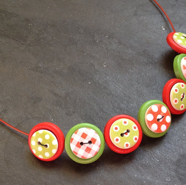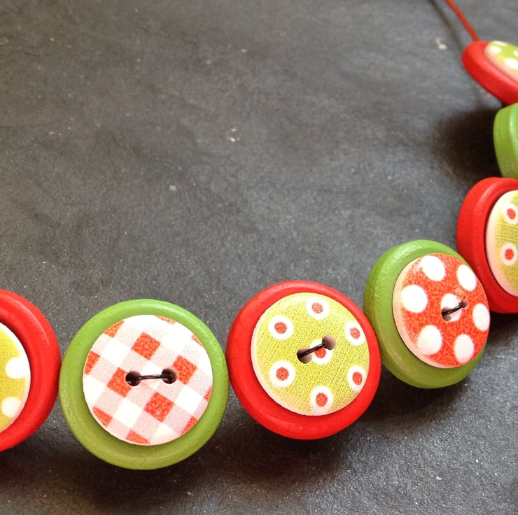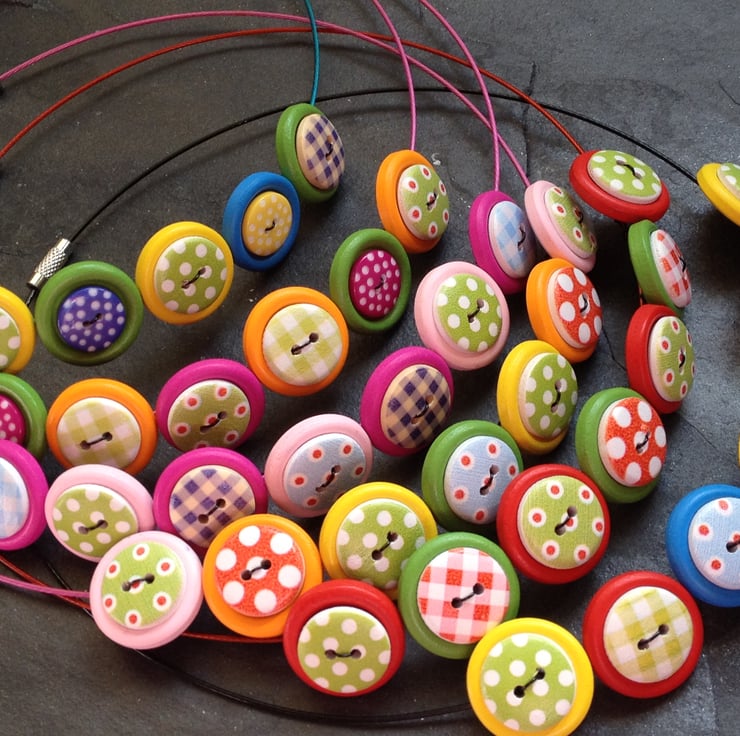 A recent new addition to kitsch creations, these button necklaces have been made by layering brightly coloured wooden buttons with smaller polkadot and gingham designs onto a semi-rigid coloured coated beading wire choker for a vibrant take on the shabby chic look.