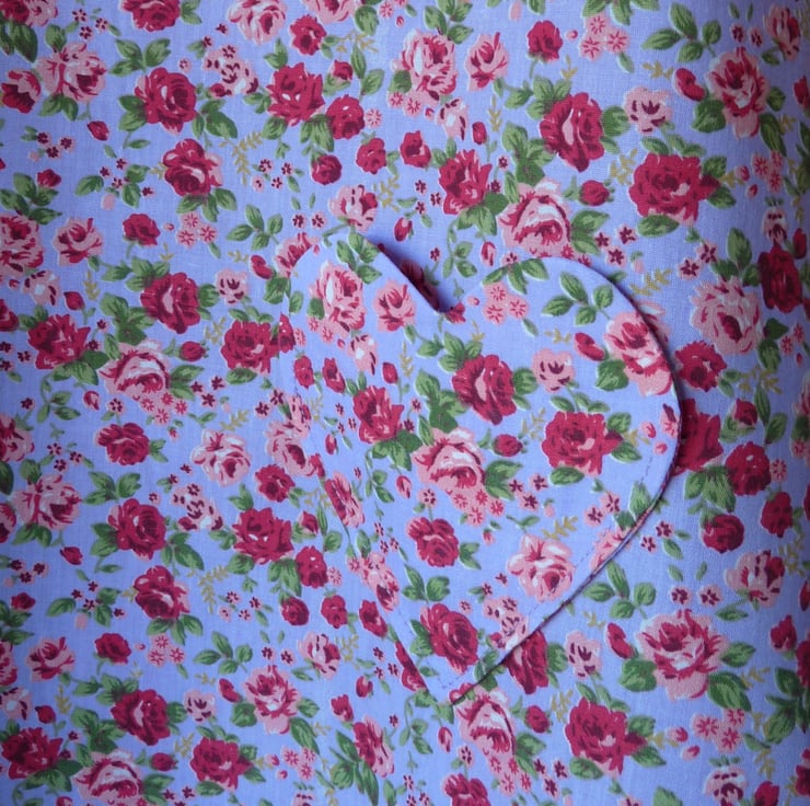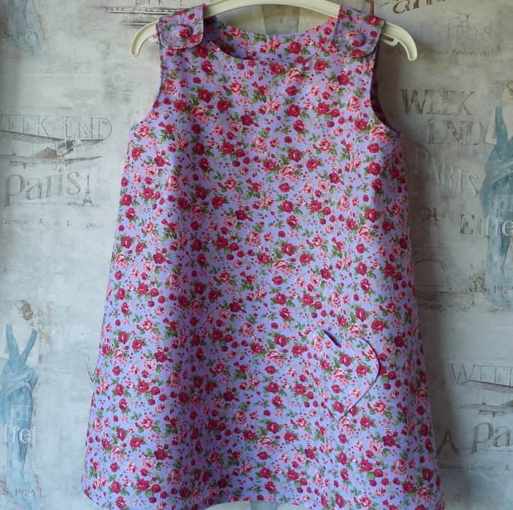 This gorgeous dress is made from a beautiful lilac coloured floral fabric. It looks very pretty as a sun dress on warmer days or over a t-shirt on cooler days. It has self covered buttons and a heart pocket.