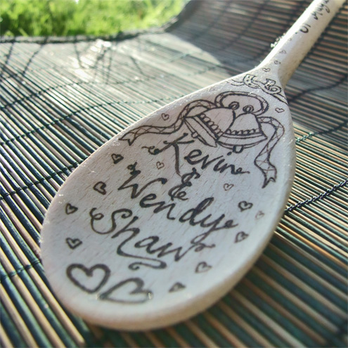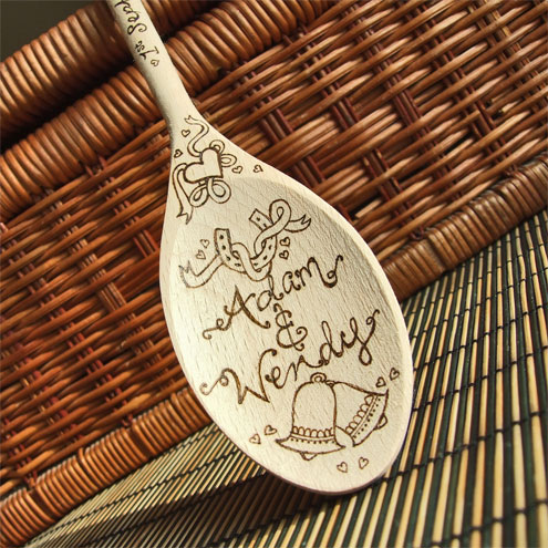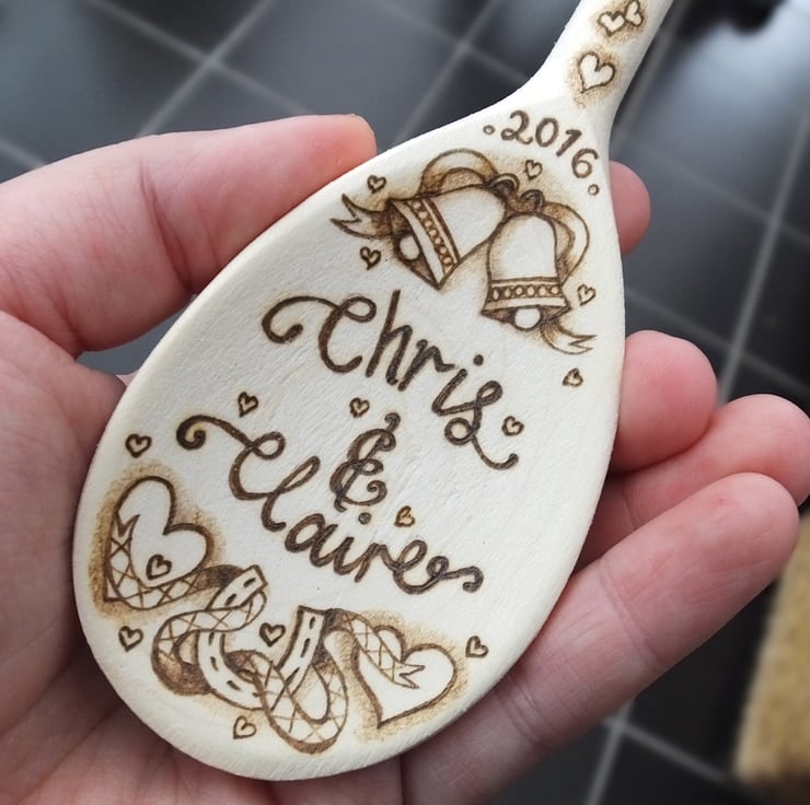The process is completely personalised. Please drop me a message with the names, dates and simple images you'd like. As these are more often than not commemorative spoons, they are varnished after completion, let me know if you would like the spoon unvarnished.