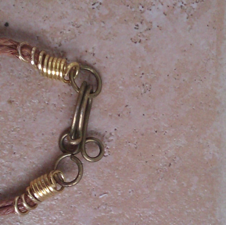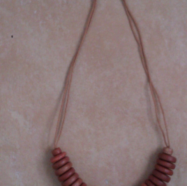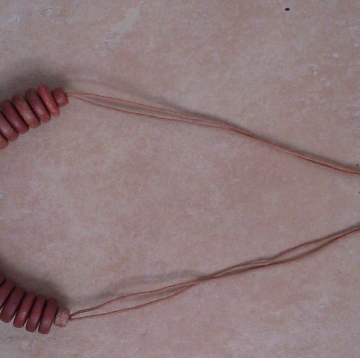 25 graduated wooden disk beads make up the focal point of this necklace. This central part of the necklace had been made with beading wire, from the loops at each end there is a double length of brown waxed cord. The total length of the necklace including the fasteners is 54cm / 21 inches.