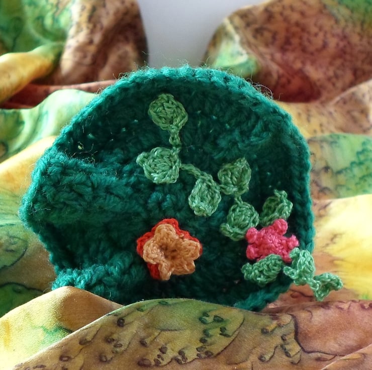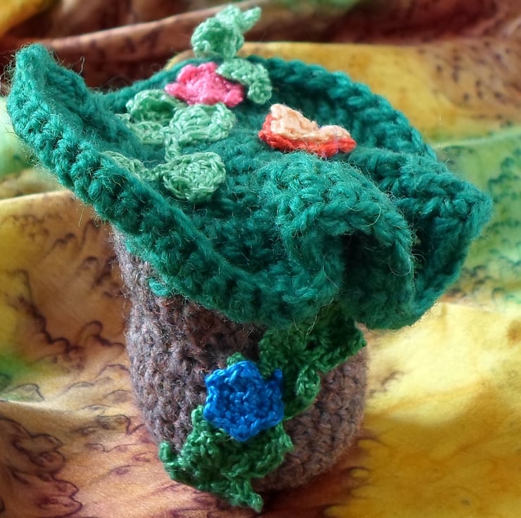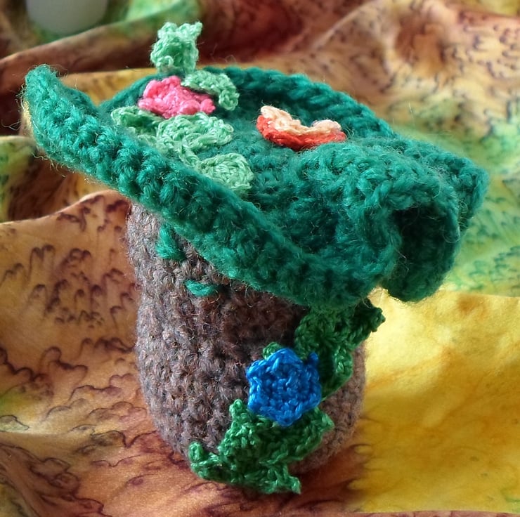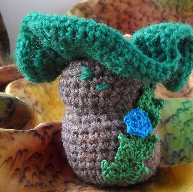 This mushroom is crocheted from mid brown and green yarn and decorated with exotic vines and tiny flowers.