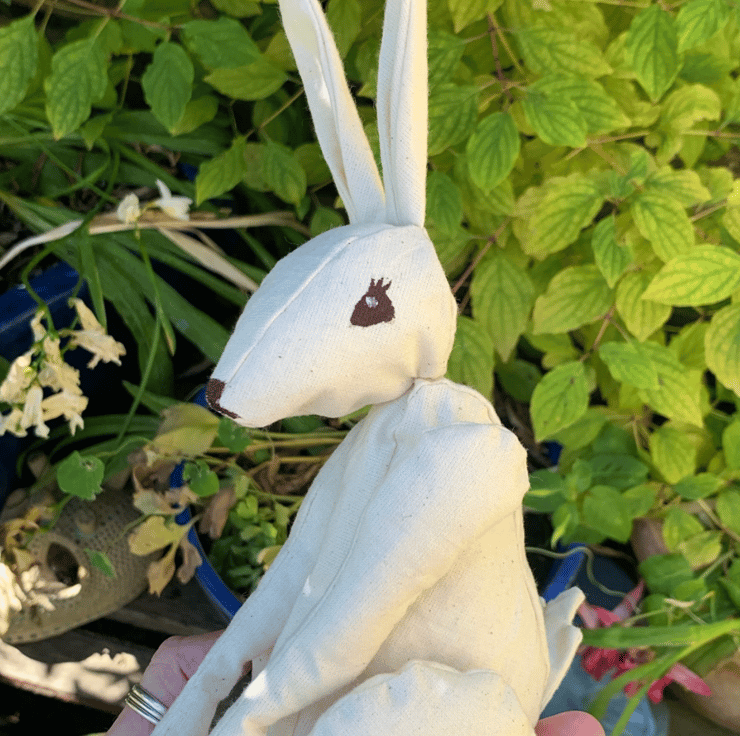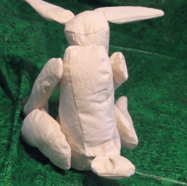 The bunny is a small size that fits in the palm of your hand, I use plastic beads in the ends of the limbs and then toy stuffing for the rest of the body and head. Originally I used split peas which did work incredibly well.