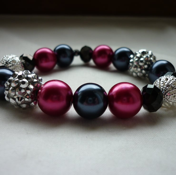 THE BRACELET HAS BEEN MADE WITH 12MM GLASS PEARLS IN SHADES OF RASPBERRY AND DARK GREY ALONG WITH FACETED GLASS RONDELLE BEADS IN JET MIRROR PLATE, SILVER PLATED FILIGREE SPACER BEADS AND RHINESTONE RESIN SILVER BEADS. ALL HAVE BEEN STRUNG ONTO BEADALON ELASTIC CORD.