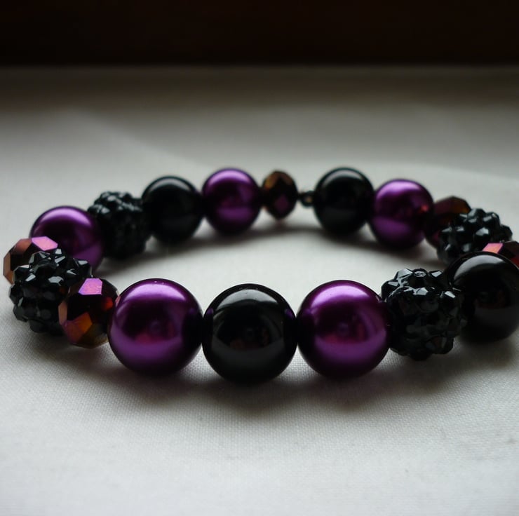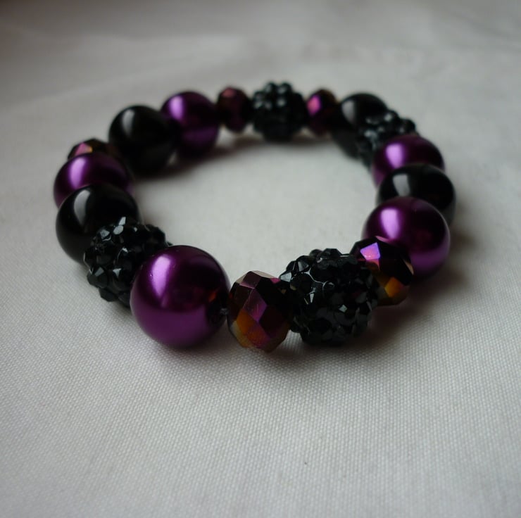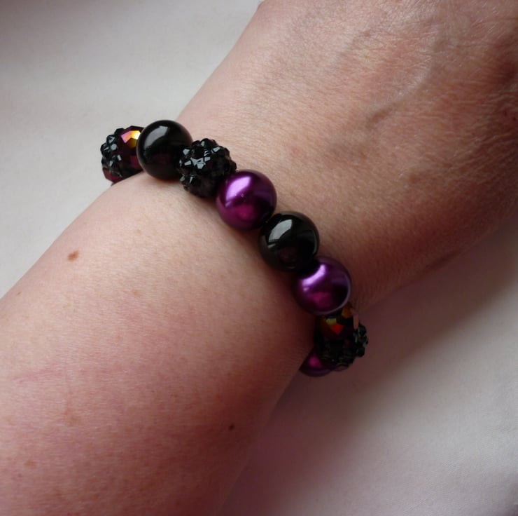 THE BRACELET HAS BEEN MADE WITH 12MM GLASS PEARLS IN SHADES OF MAGENTA AND BLACK ALONG WITH GLASS FACETED RONDELLE BEADS IN PURPLE IRIS AND BLACK RESIN RHINESTONE BEADS, ALL HAVE BEEN STRUNG ONTO BEADALON ELASTIC CORD.