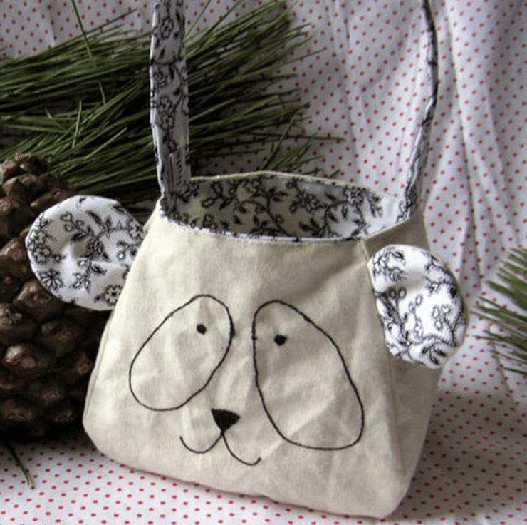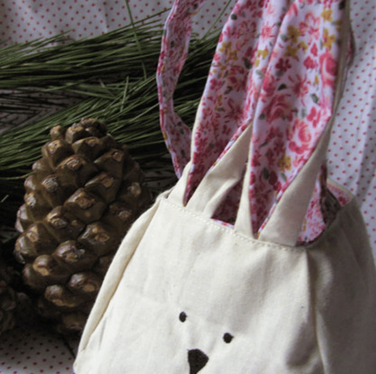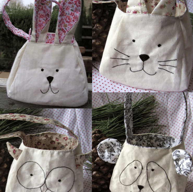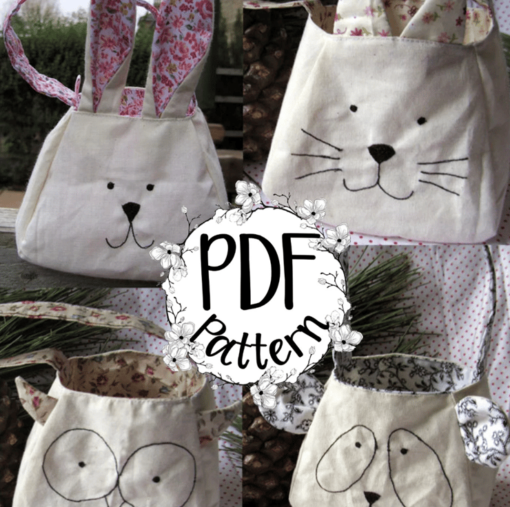DIY sewing pattern. From this pattern you can make a Rabbit, Panda, Owl or Kitty bag. These are cute characters that are useful for storage, tiny picnics, gift giving, easter or other holidays.