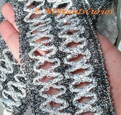 Both edges are straight, with the double cross over lattice design detail in the centre. The trim is stiff, thick and metallic in texture, so not something you would probably use on clothing.