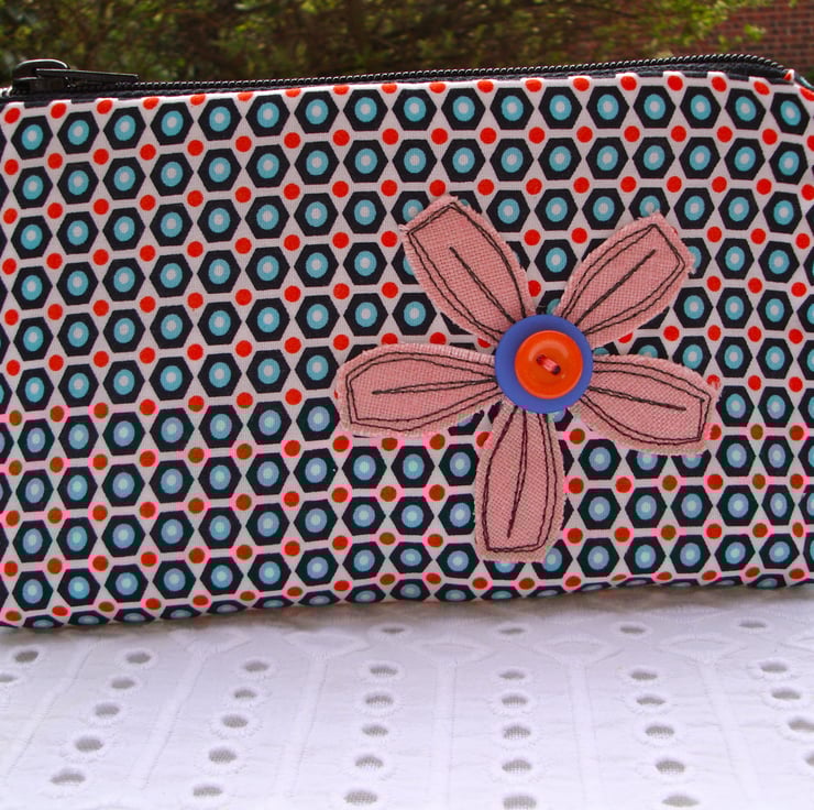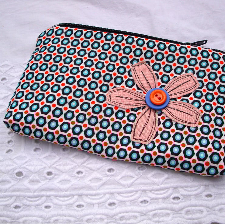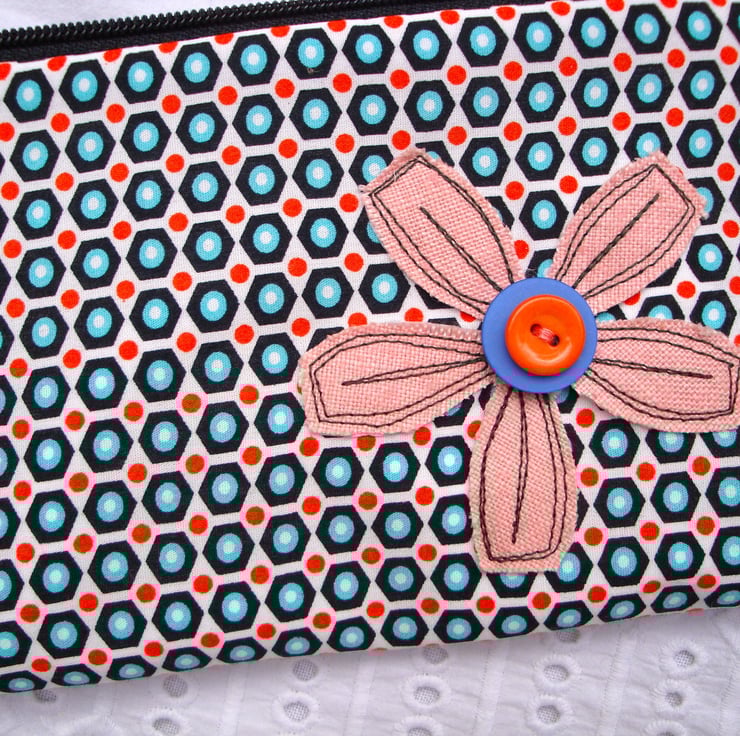 SALE Cotton Pencil case - appliquéd flower - make up bag .