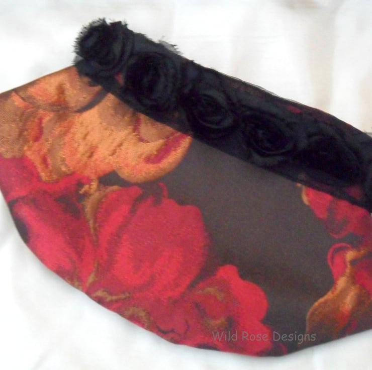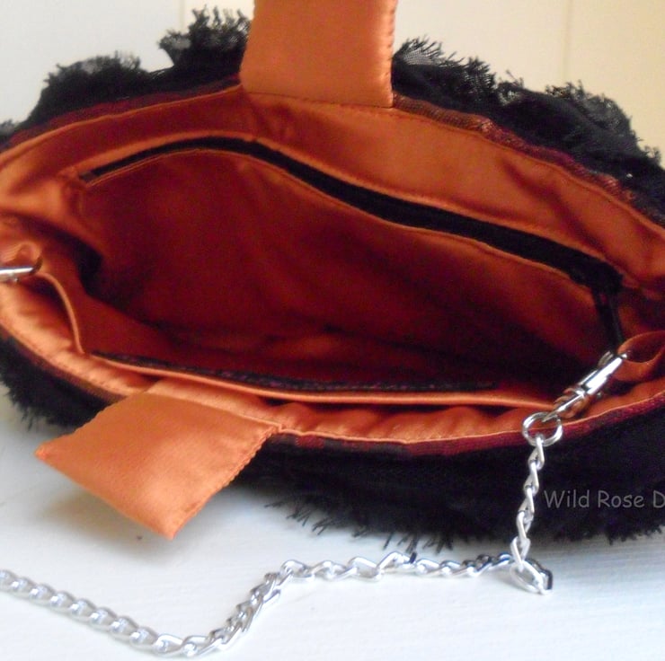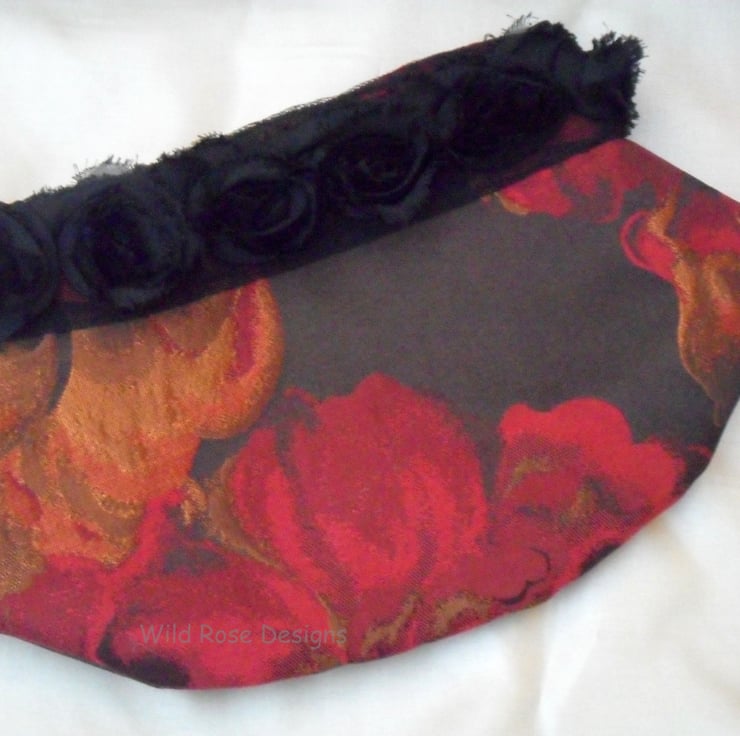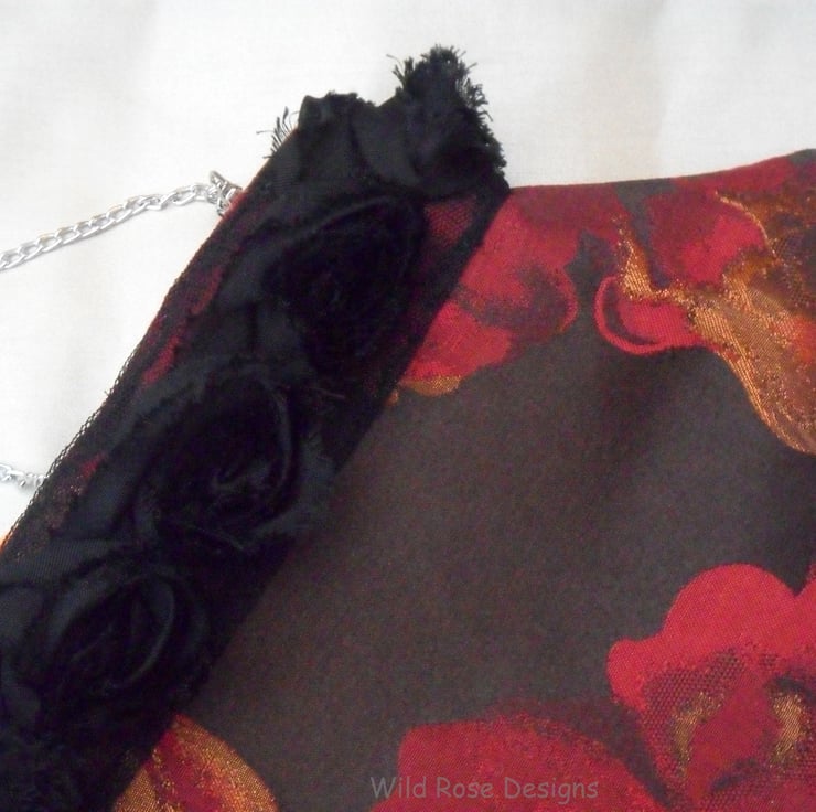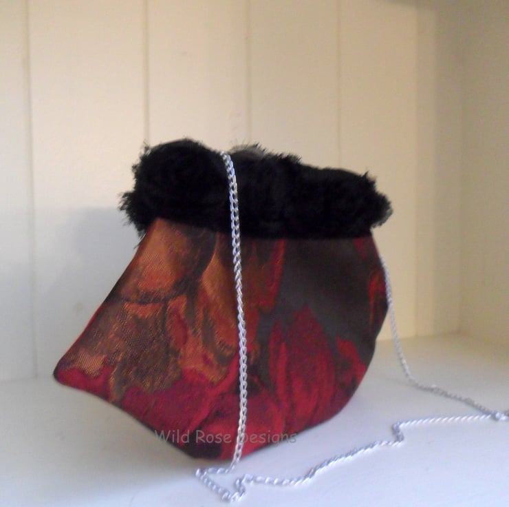 A handmade evening clutch bag made in a rich red, black and gold brocade. The bag is finished with a black rosette trim and closes with a magnetic snap. Inside it is lined in a striking orange/gold satin and it has a slip pocket and a small zipped pocket. There is a 90 cm silver coloured chain handle that can be removed or tucked inside when not needed. If you would prefer a gold coloured chain please message me when you buy.