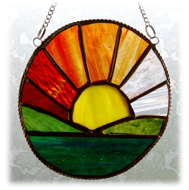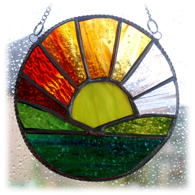 The sun's rays are made from 7 different colours and textures of red and amber glass with lots of streaks to denote the rays.
