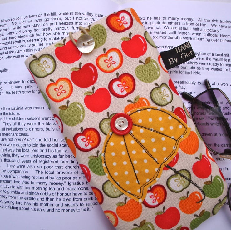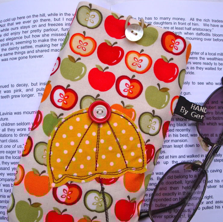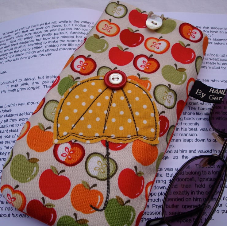 Front of case is made in a lovely printed cotton, featuring a selection of apples . I also appliquéd a yellow polkadot umbrella to the front , embellished with buttons.