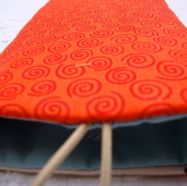 Back is made in a printed orange cotton fabric ( see photo ) . External fabric has been mounted to a backing fabric , for body and strength.