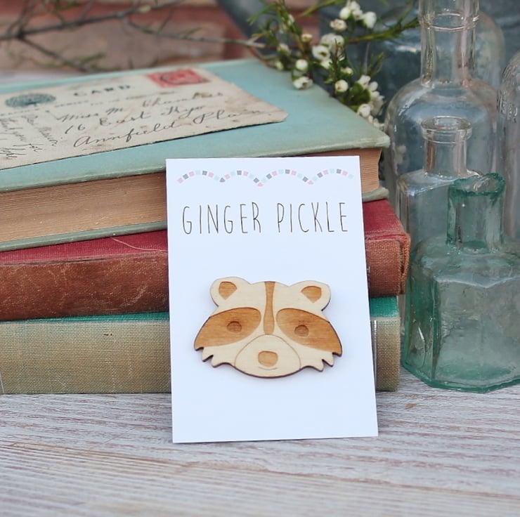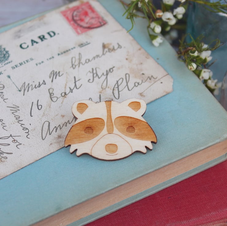This cute wooden racoon brooch has been laser cut from 3mm birch plywood. It is glued securely to a silver plated brooch bar and has been coated in wood oil to protect the wood and give it a beautiful finish. The wood comes from a natural source and is FSC certified meaning it's environmentally friendly.