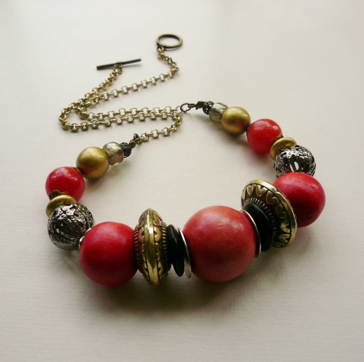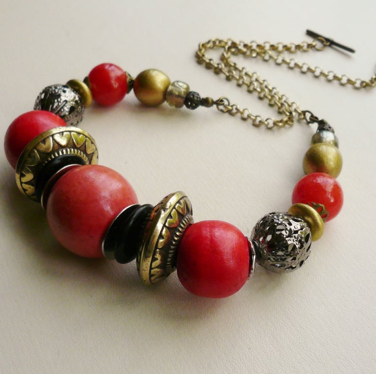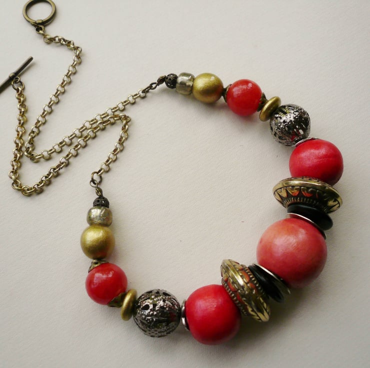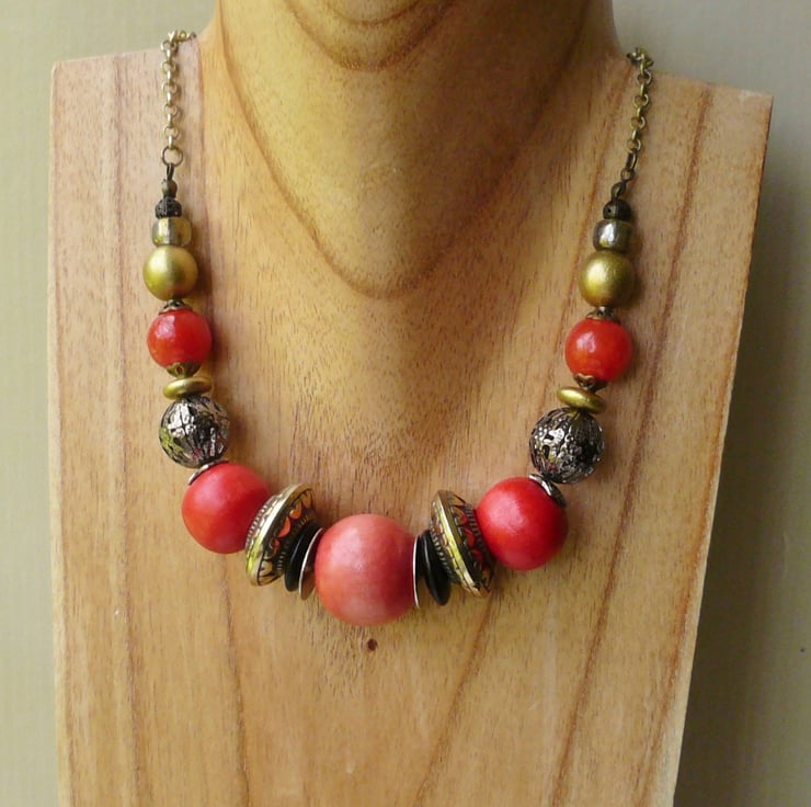 This necklace is made up of graduating beads in warm tones of red and coral in wood, glass, stone and resin. Largest central bead measures 20mm. Also includes gold coloured metalised rondelle spacer beads and round gunmetal filigree beads. Finished with Tibetan silver plated and antique bronze bead caps, antique gold finish chain and antique bronze toggle clasp.