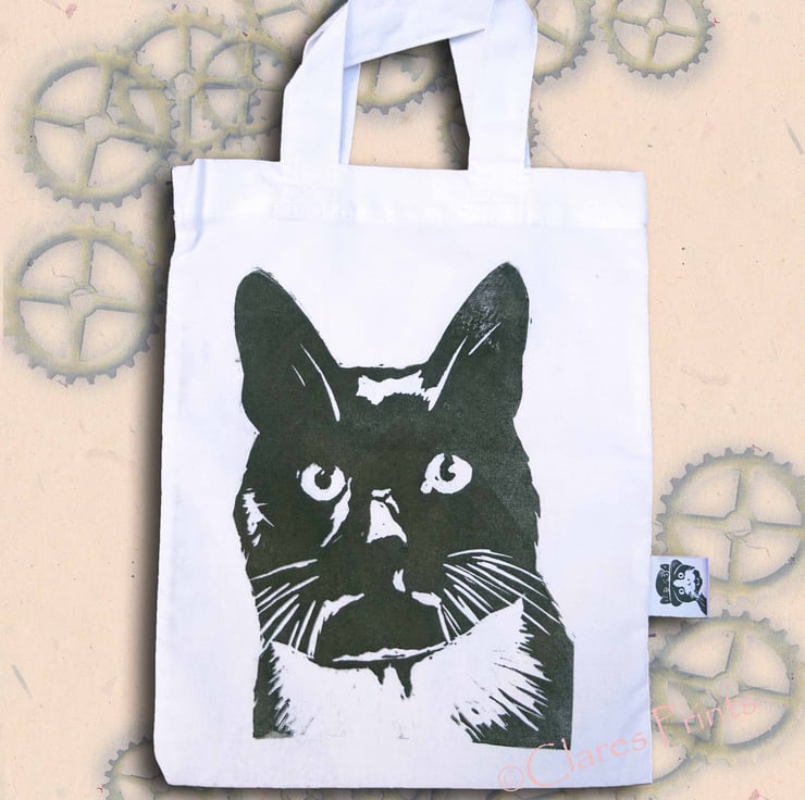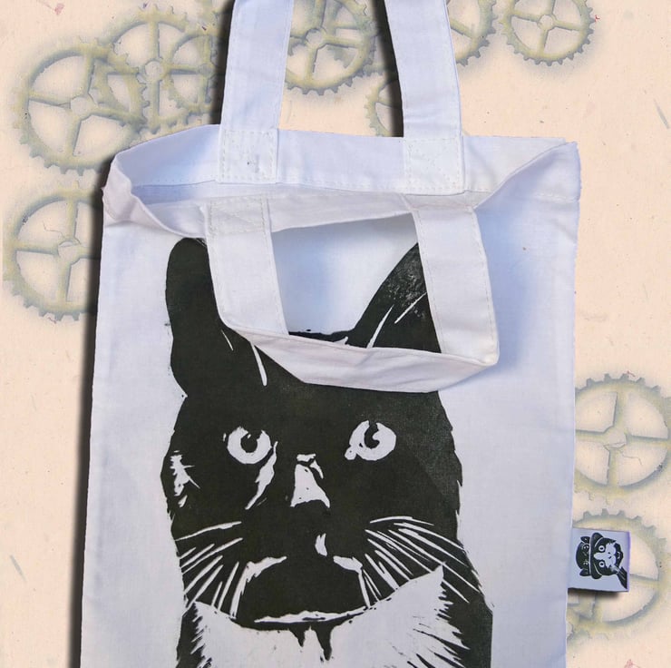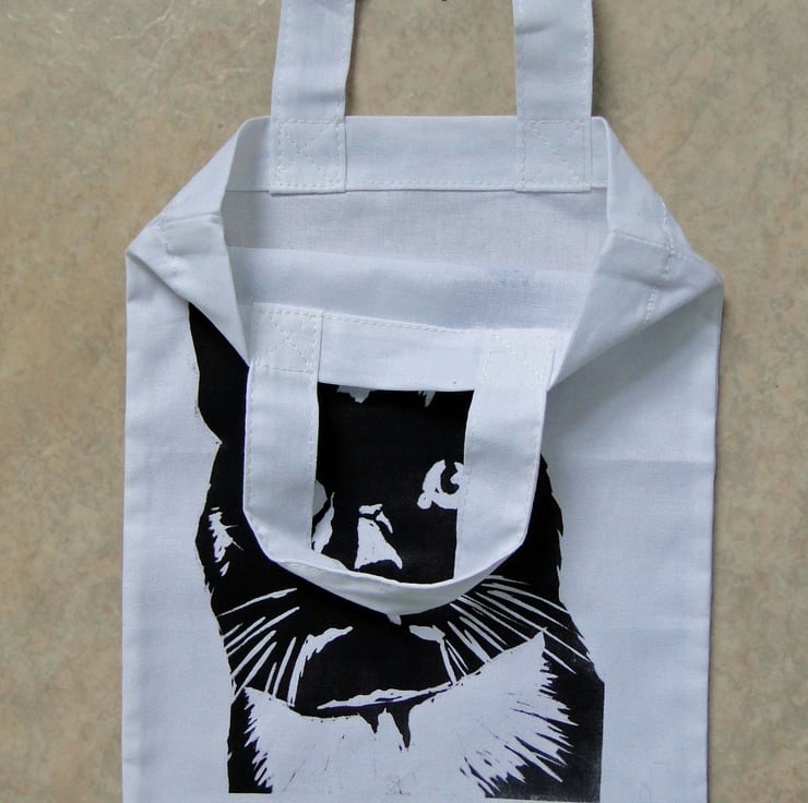 Hand printed white 100% cotton mini tote bag.