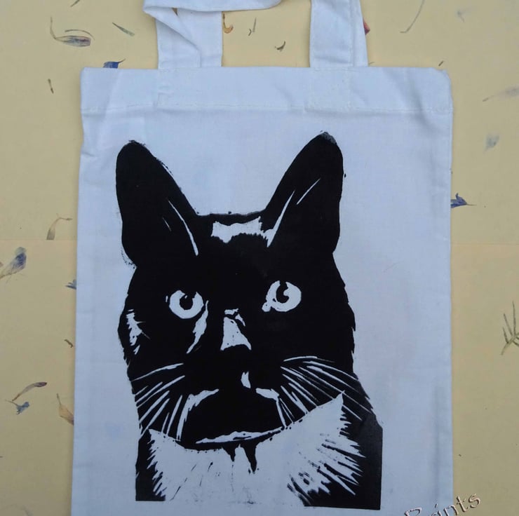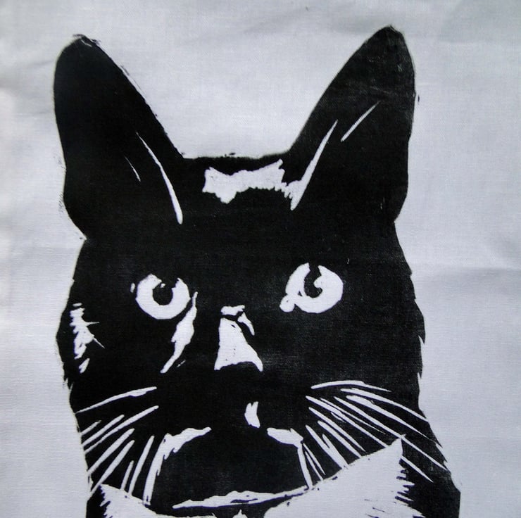 Lino print of a cute cat in black oil based ink.