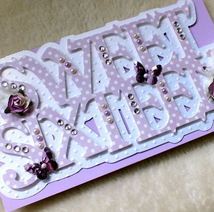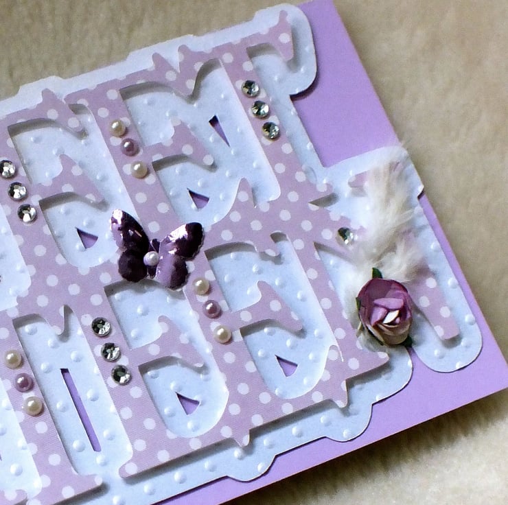 Supplied with a matching purple envelope and protective cellophane bag, posted in a sturdy cardboard box, large letter size, which can be re-used (recommended) if posting on to protect the card embellishments.