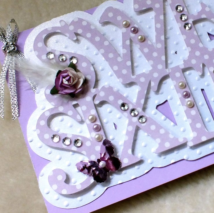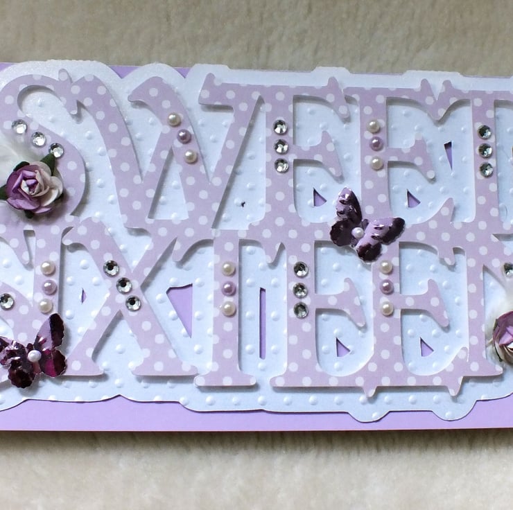 This pretty handmade 'Sweet Sixteen' word card is perfect for a teenager's sixteenth birthday. The card base is made from premium quality centura card stock which has a pearlised finish, embossed with dotty dots and embellished with roses, faux gems and pearls, plus dainty butterflies. The card includes the sentiment 'Happy Birthday' inside, and is approx. DL in size.