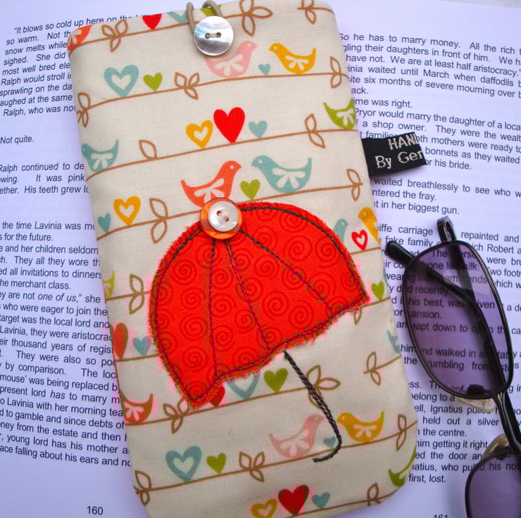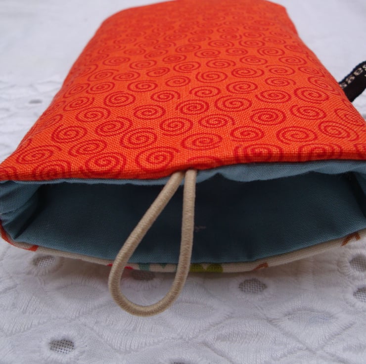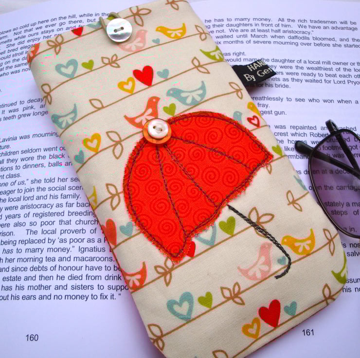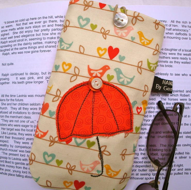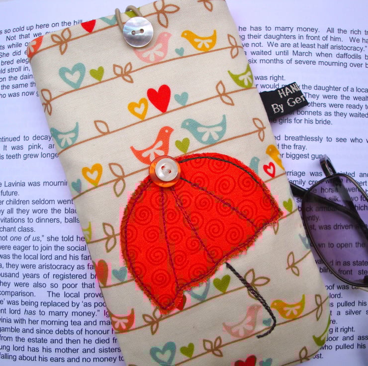 I appliquéd a funky orange cotton fabric umbrella to the front, and embellished with buttons. I used the same orange fabric for the back of the case .