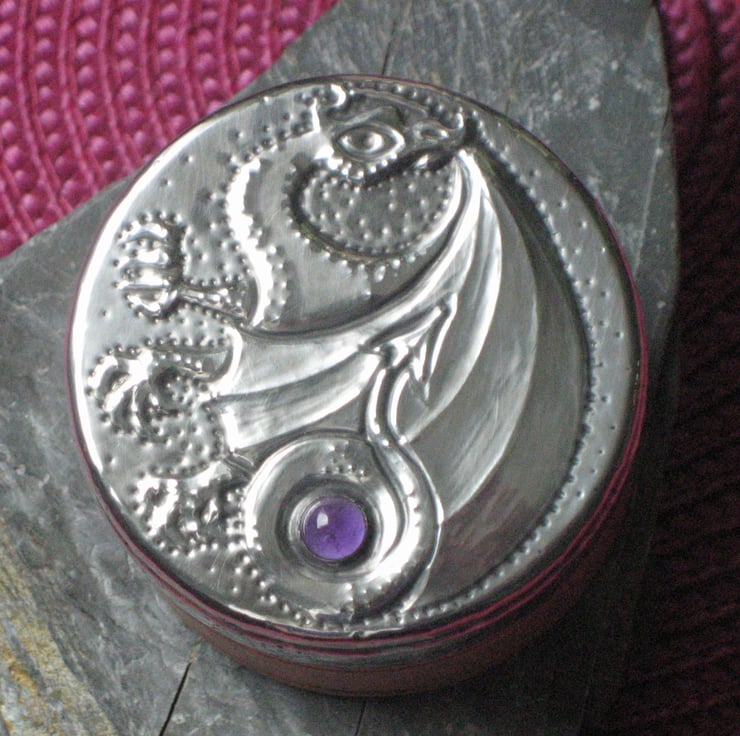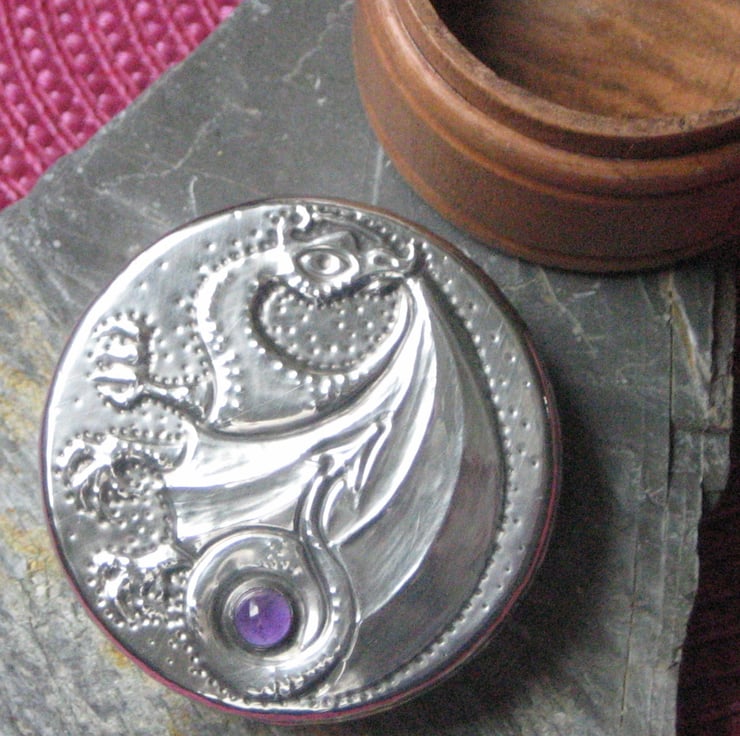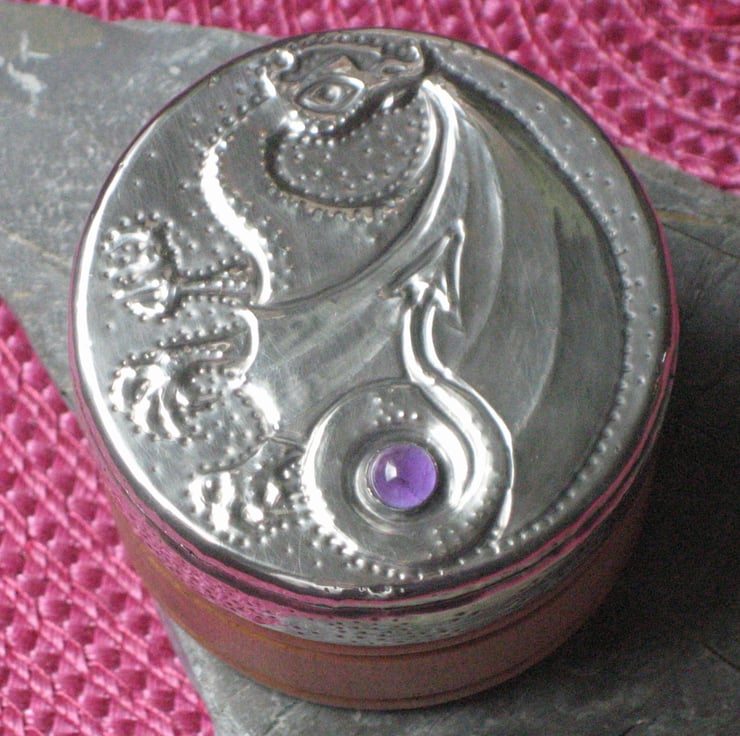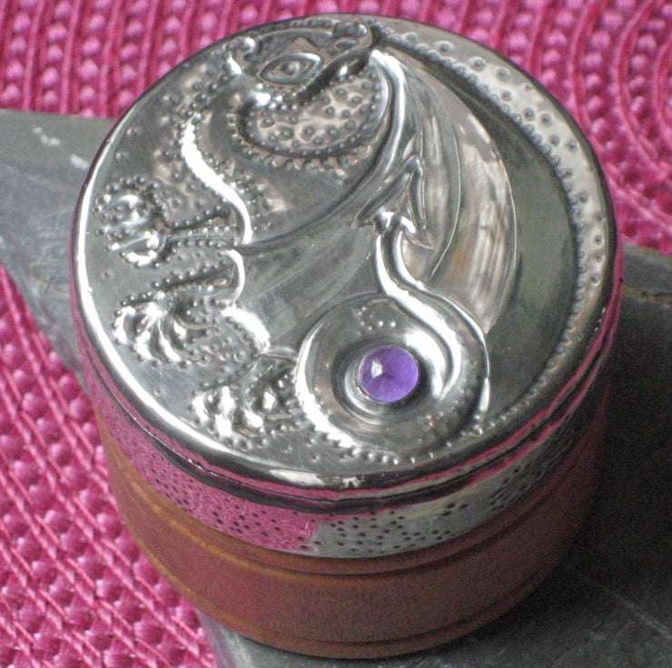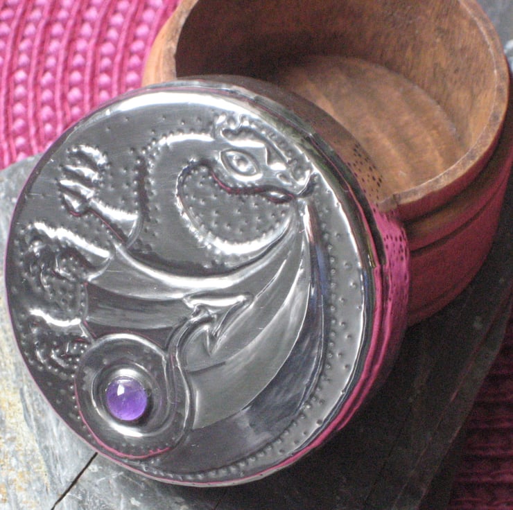 This small wooden box has been transformed with a lid of pewter, featuring a genuine amethyst cabochon. It measures 44mm,1.75ins,in height and is 55mm, 2.25ins, in diameter. The wood has been lightly tinted. Perfect for small treasures. A great gift for a 10th Wedding Anniversary, Birthday, Father's Day, Mother's Day or any other special occasion.
