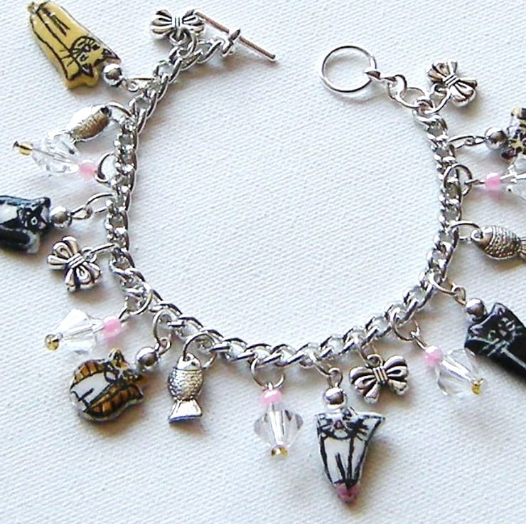 this is a unique cat clay charm bracelet......clay cat charms are hand crafted and hand painted then given several layers of durable laquer to protect them.....clay charms are attached to a seven and half ins silver plated chain bracelet..together with Tibetan Silver charms and various acrylic beads ......bracelet has a toggle and bar clasp...will come well presented in a silk padded gift box...will be posted first class